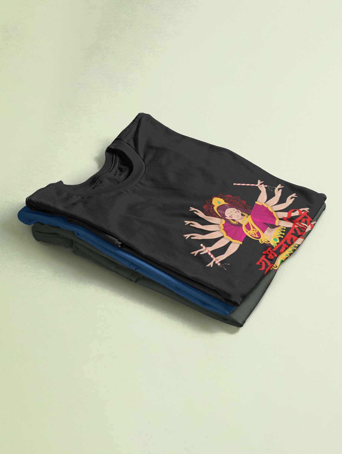 Durga Maa (weapons) animated printed unisex adults round neck cotton half-sleeve black tshirt specially for Navratri festival/ Durga puja