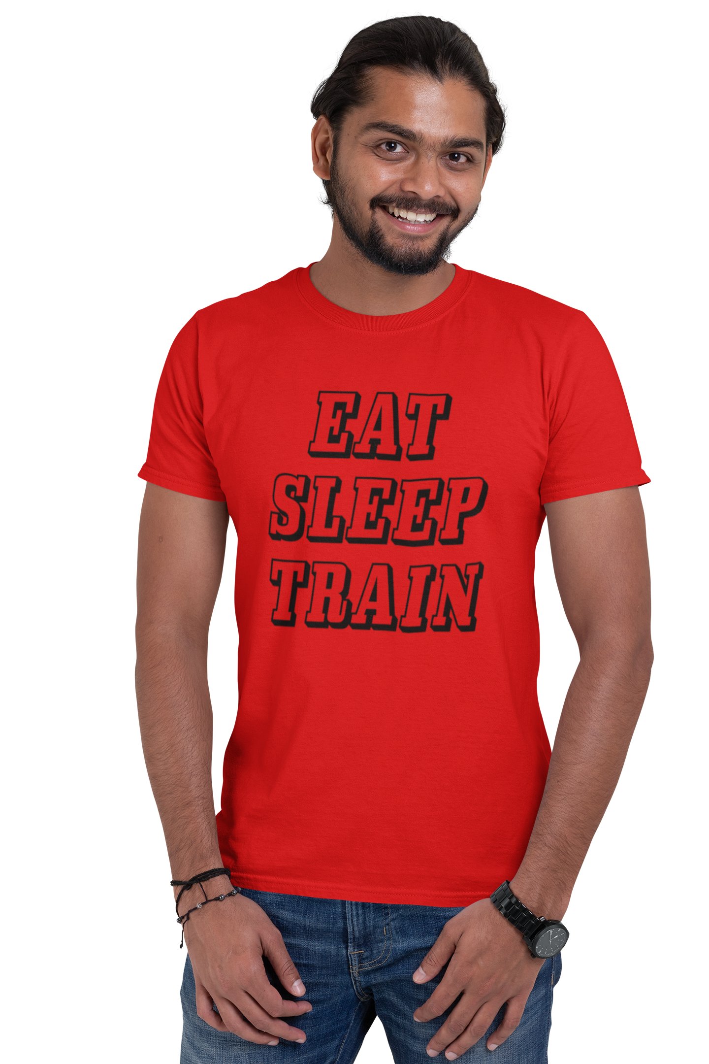 Eat, Sleep, Train, (BG Black), Round Neck Gym Tshirt (Red Tshirt) - Clothes for Gym Lovers - Foremost Gifting Material for Your Friends and Close Ones