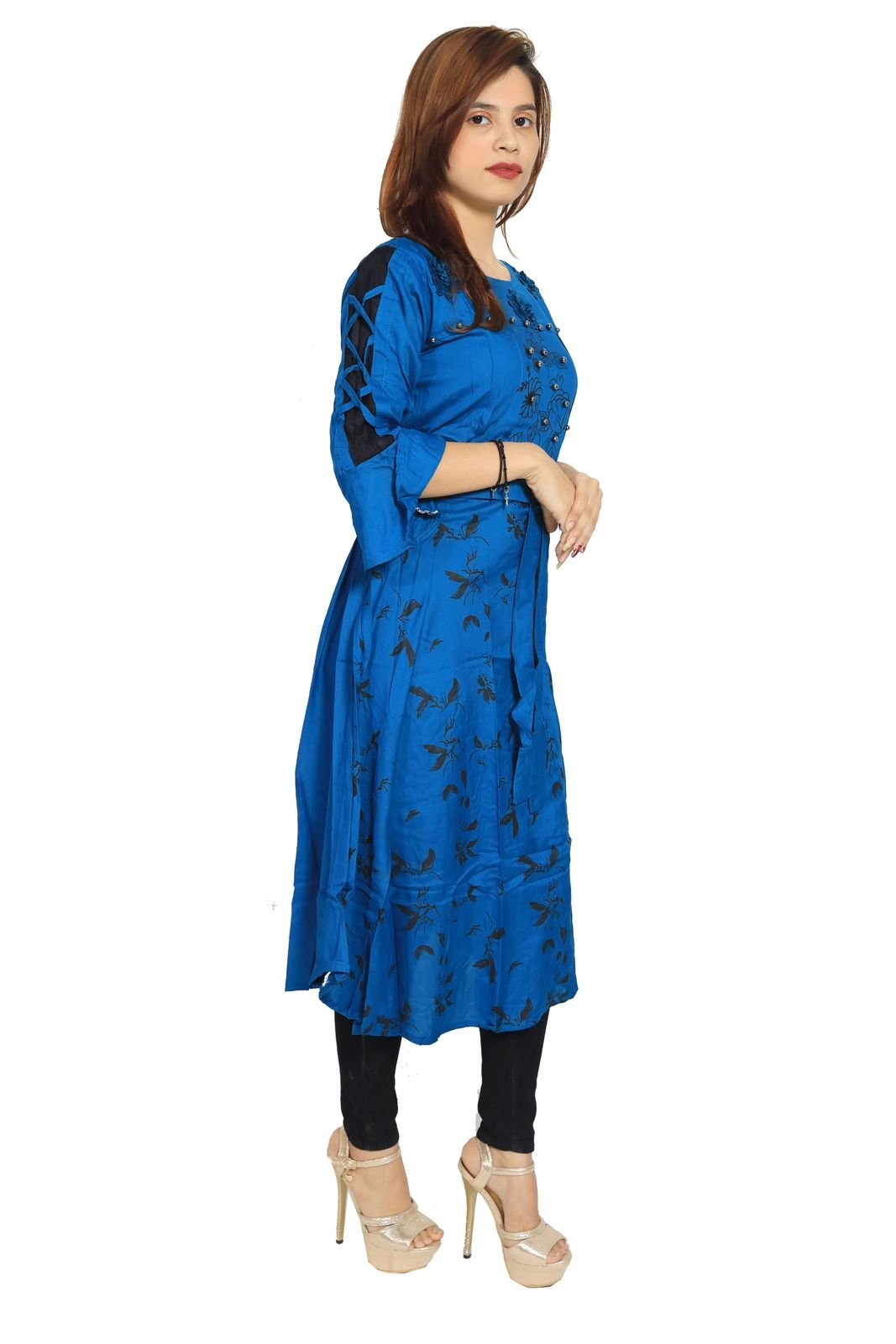 Black feather printed straight Kurti for Womens/ girls (Blue)- Made up of Rayon and designed for you plesant and comfy