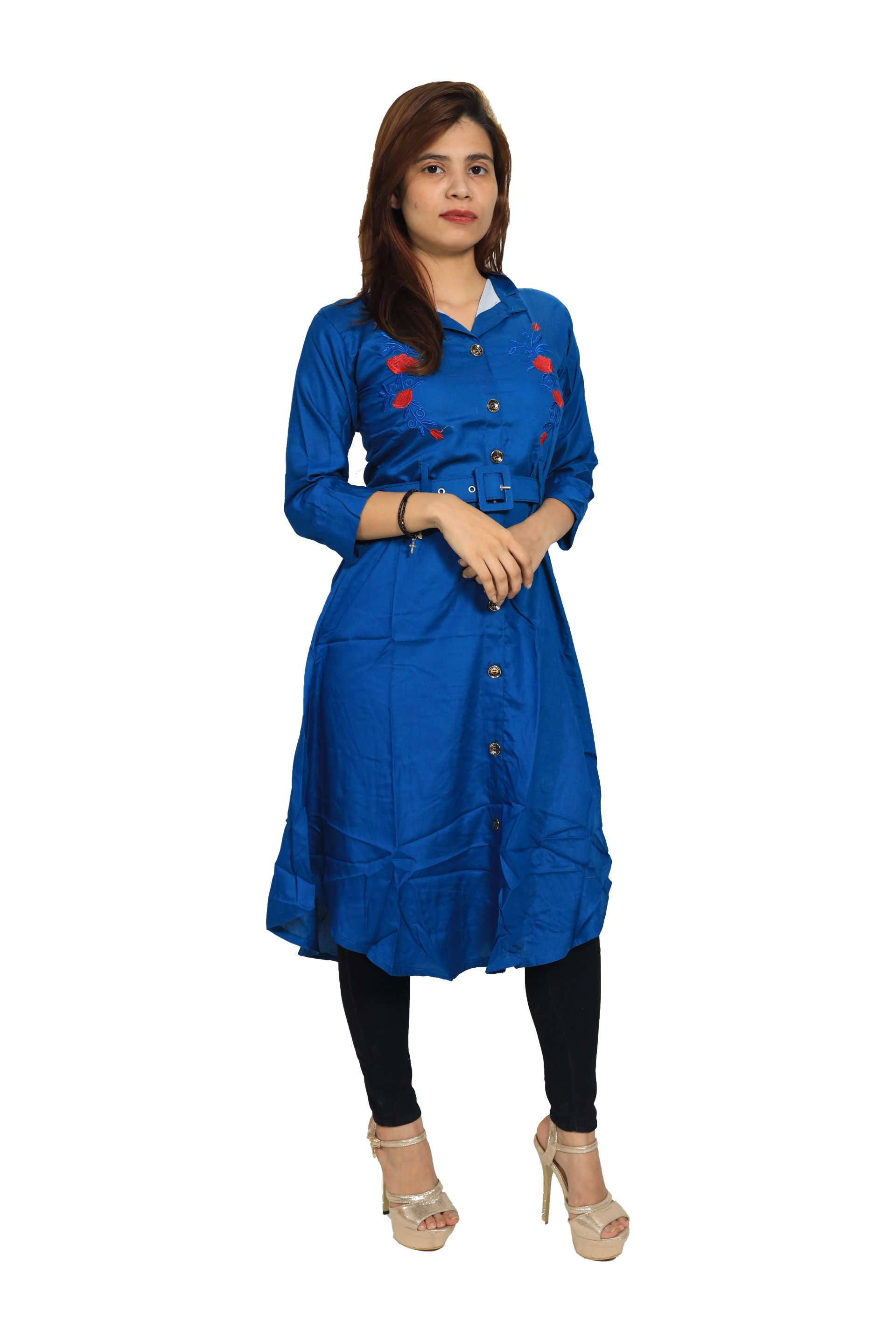 Red planted roses with a belt embroided straight Kurti for Womens/ girls (Blue Kurti) - Made up of Rayon and designed for you plesant and comfy