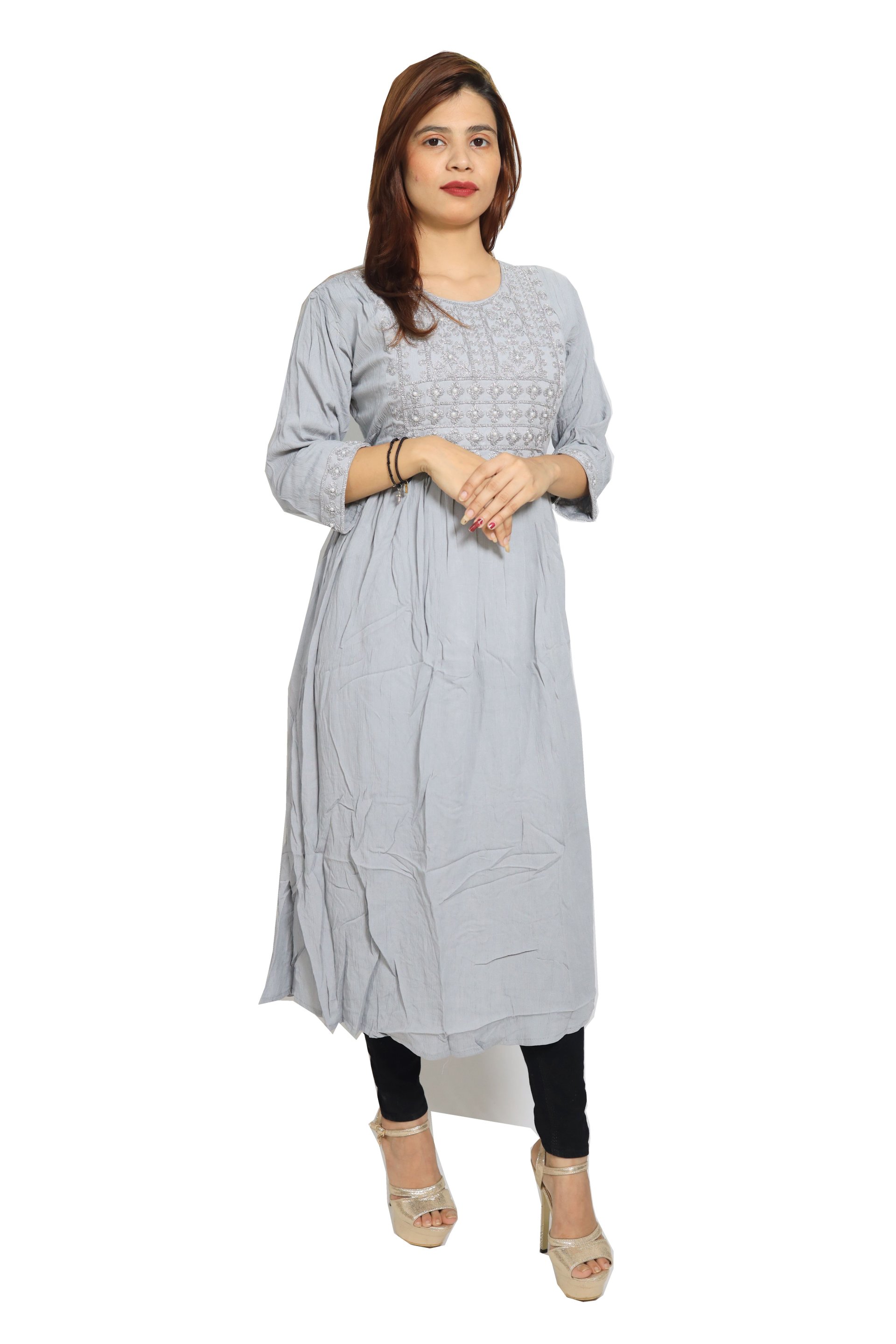 Flowers with pearl embroided straight Kurti for Womens/ girls (Grey)- Made up of Rayon and designed for you plesant and comfy
