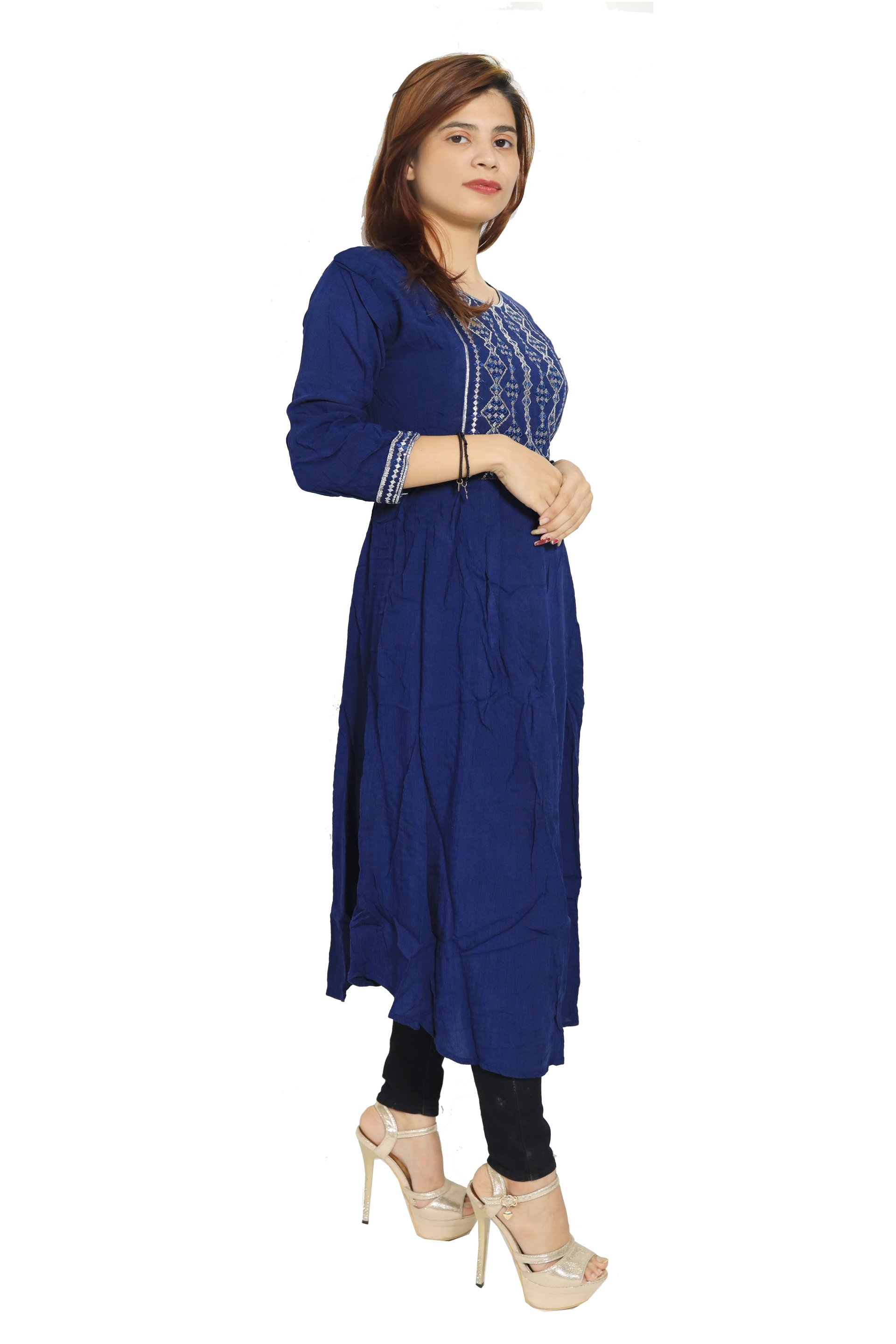Blue white curved squares embroided straight kurti for womens / girls (Navy Blue kurti) - Made up of Rayon and designed for you plesant and comfy