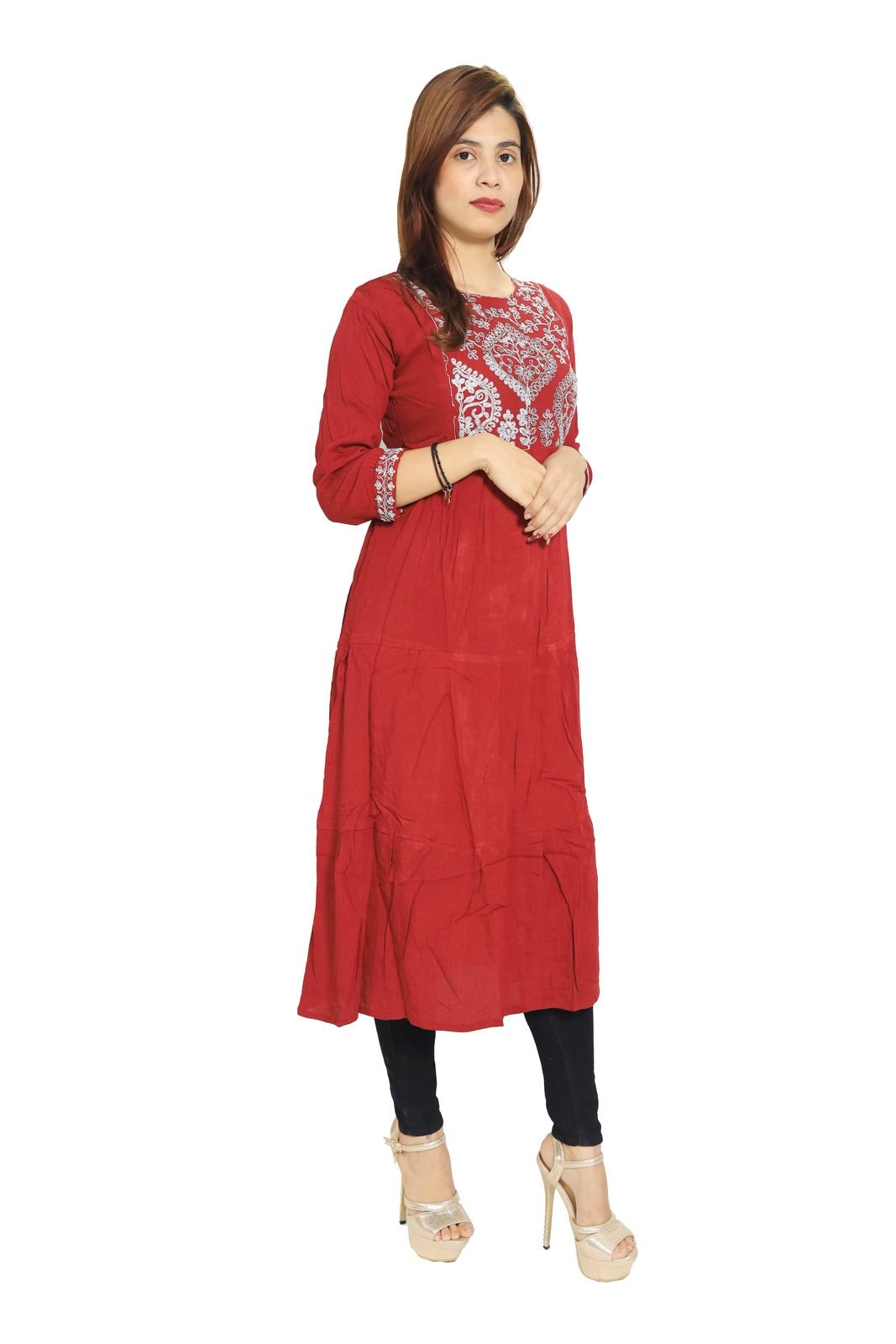 Karenji designed embroided straight Kurti for Womens/ girls (Red)- Made up of Rayon and designed for you plesant and comfy