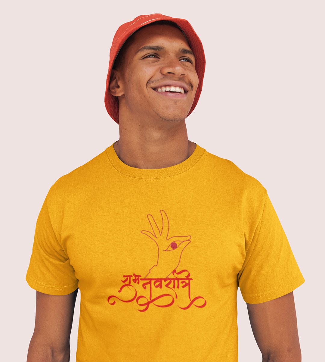 Navratri is a very auspicious festival for hindus. It takes place at the beginning of October and sometimes September. Enjoy the 9 days of festivities with full zeal and make yourself submerged in the love of Maa Durga. Navratri is also known as Durga Puja. And with this Tees, you can shine like a star during this festive season with our navratri themed cotton half sleeved Tshirts. You can pair our t-shirts with trousers and denim of your choice and make it a weekday smart casual or weekend wear. This is durable. This tshirt is smooth and soft which makes you comfortable to wear during all seasons. The printing in it is durable and odourless. It has five sizes, S,M,L,XL,XXL. The Tshirt colour is intact even after repeated washes. It can be kept in your wardrobe and hangers. Please avoid washing mashine to clean this Tee, it may affect the print. Hand wash only. We have brought you many navratri related designs printed on our different colour Tshirts to choose from. Grab it now.
