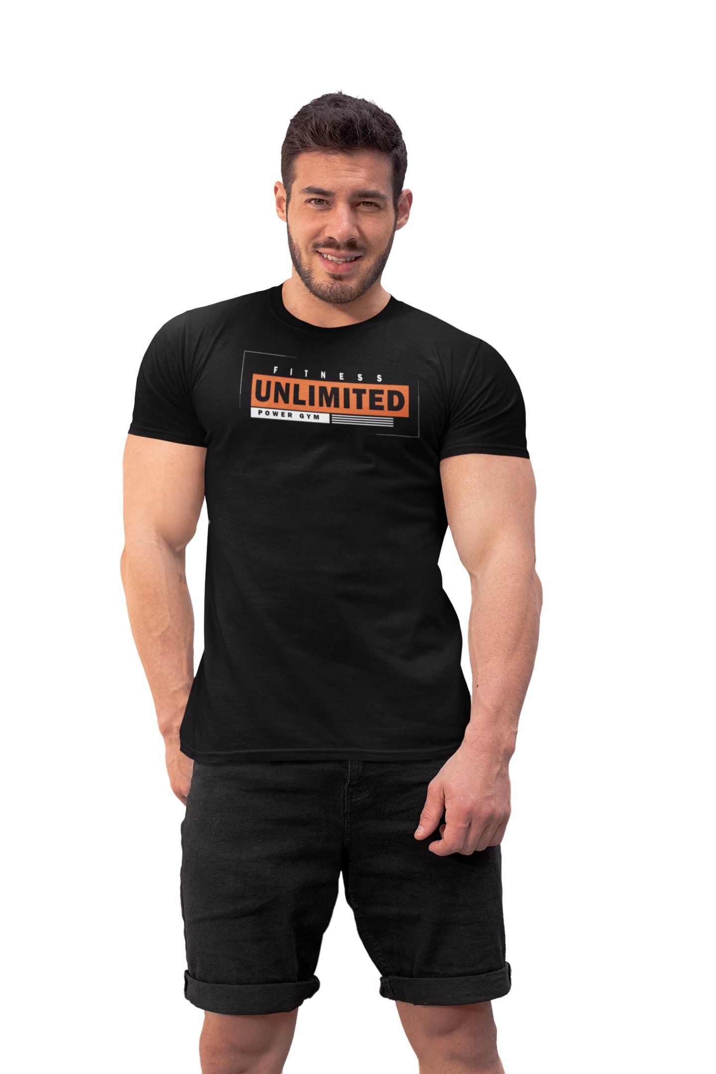 Fitness, Unlimited, Power Gym, 4 Dashes (BG Orange and Black), Round Neck Gym Tshirt (White Tshirt) - Clothes for Gym Lovers - Suitable for Gym Going Person - Foremost Gifting Material for Your Friends and Close Ones