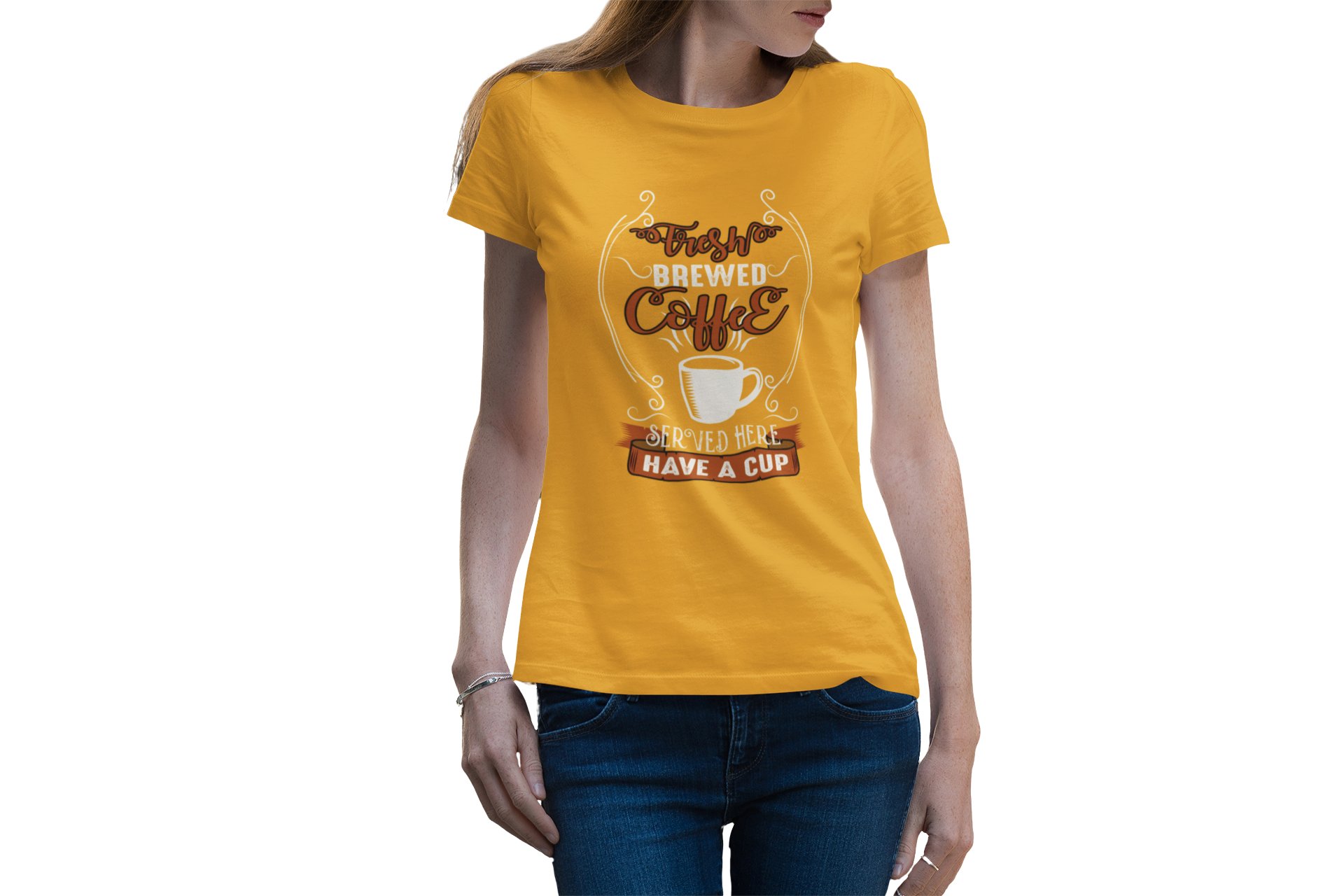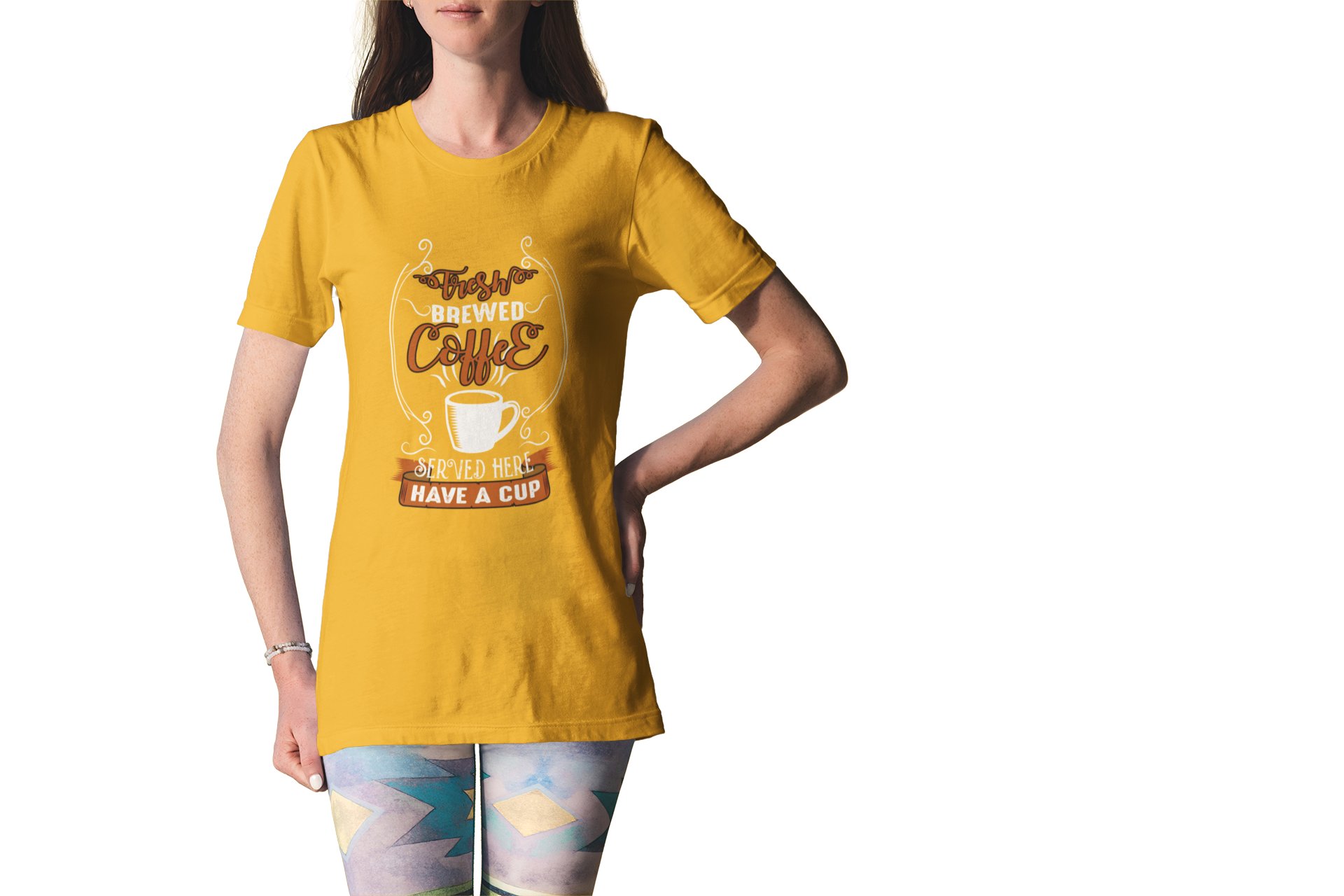 Fresh brewed Coffee served here have acup - Yellow - printed t shirt - comfortable round neck cotton.