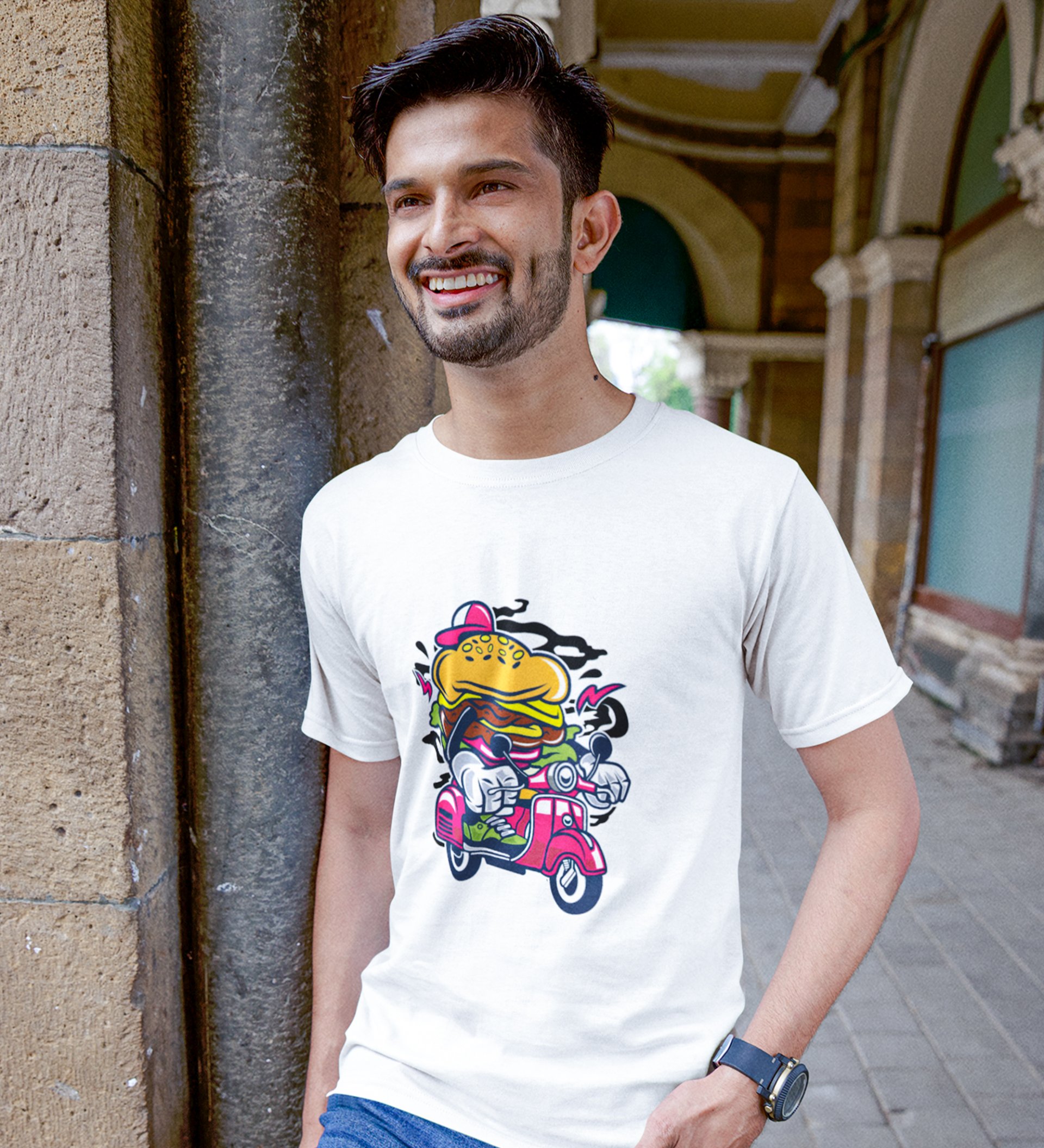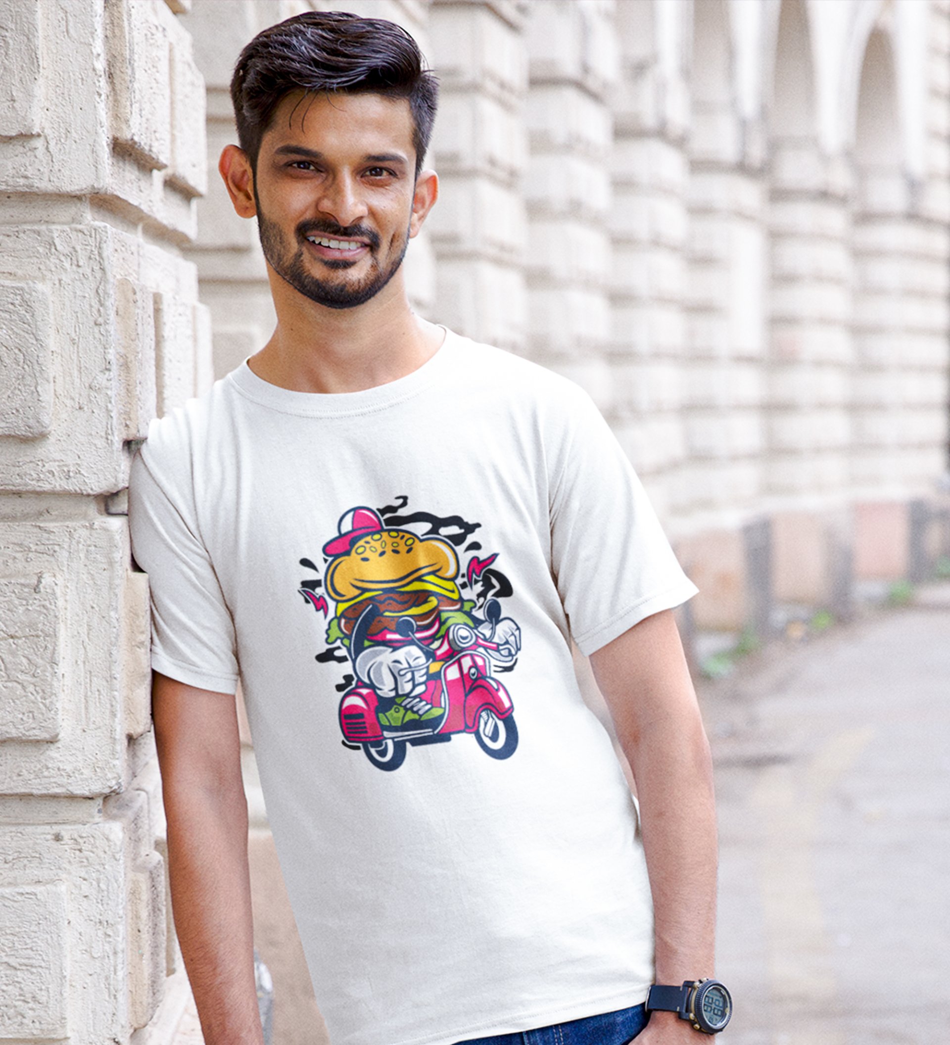 Rider Burger White Round Neck Cotton Half Sleeved Men's T-Shirt with Printed Graphics