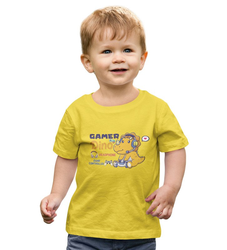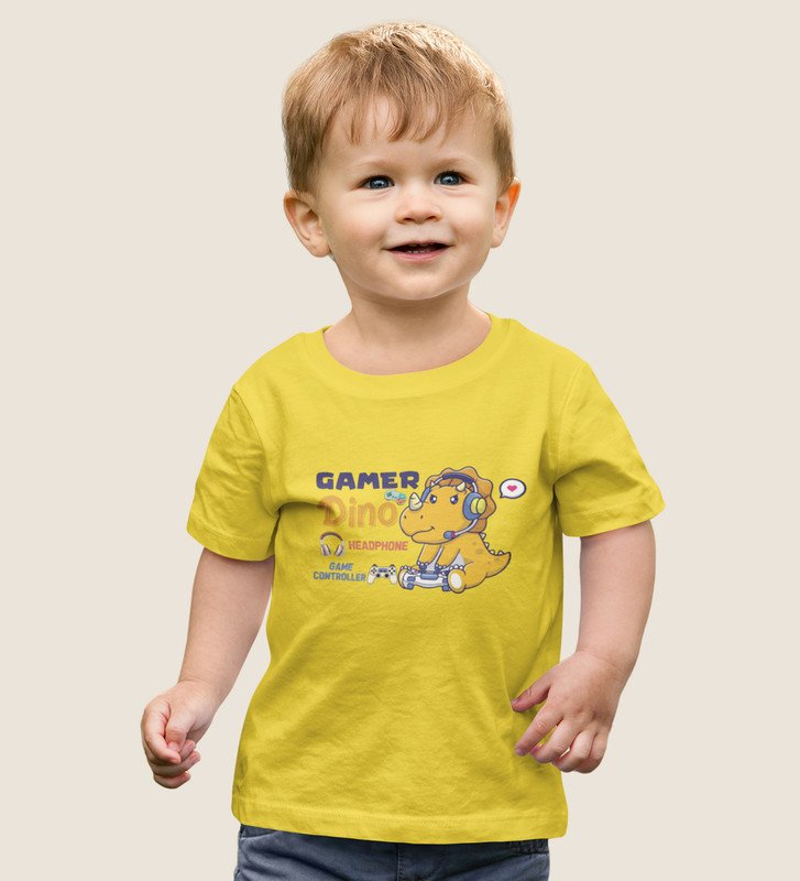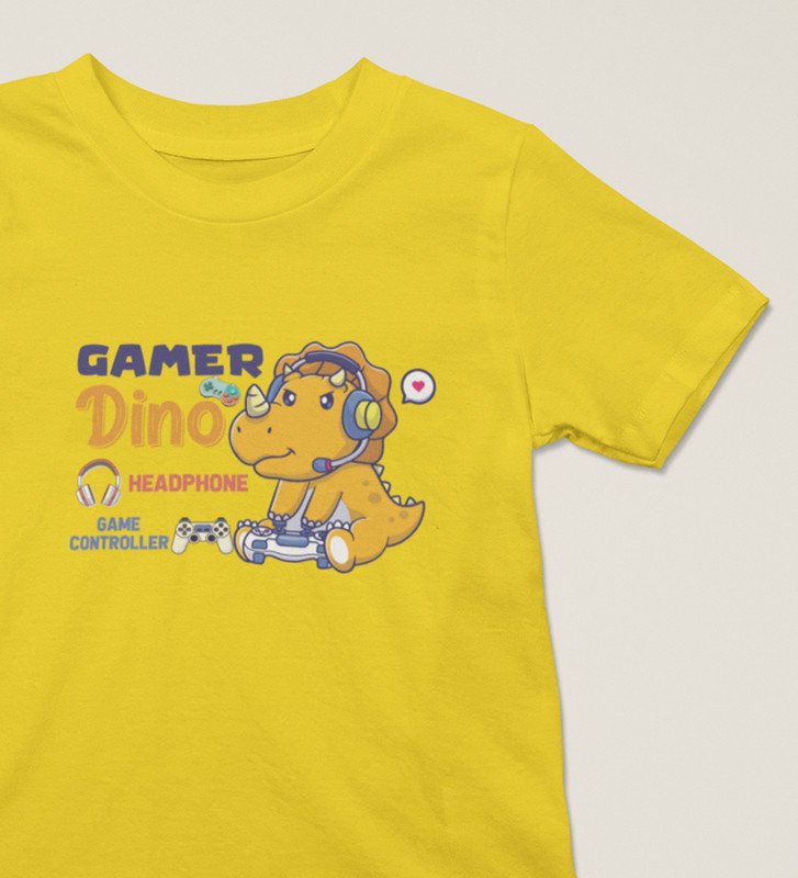 Gamer Dino, Boys Round Neck Blended Cotton Tshirt (Yellow)