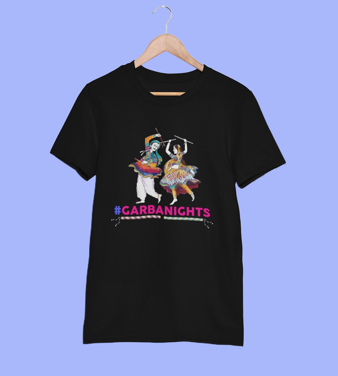 Garba Nights (Playing Dandiya) printed unisex adults round neck cotton half-sleeve black tshirt specially for Navratri festival/ Durga puja