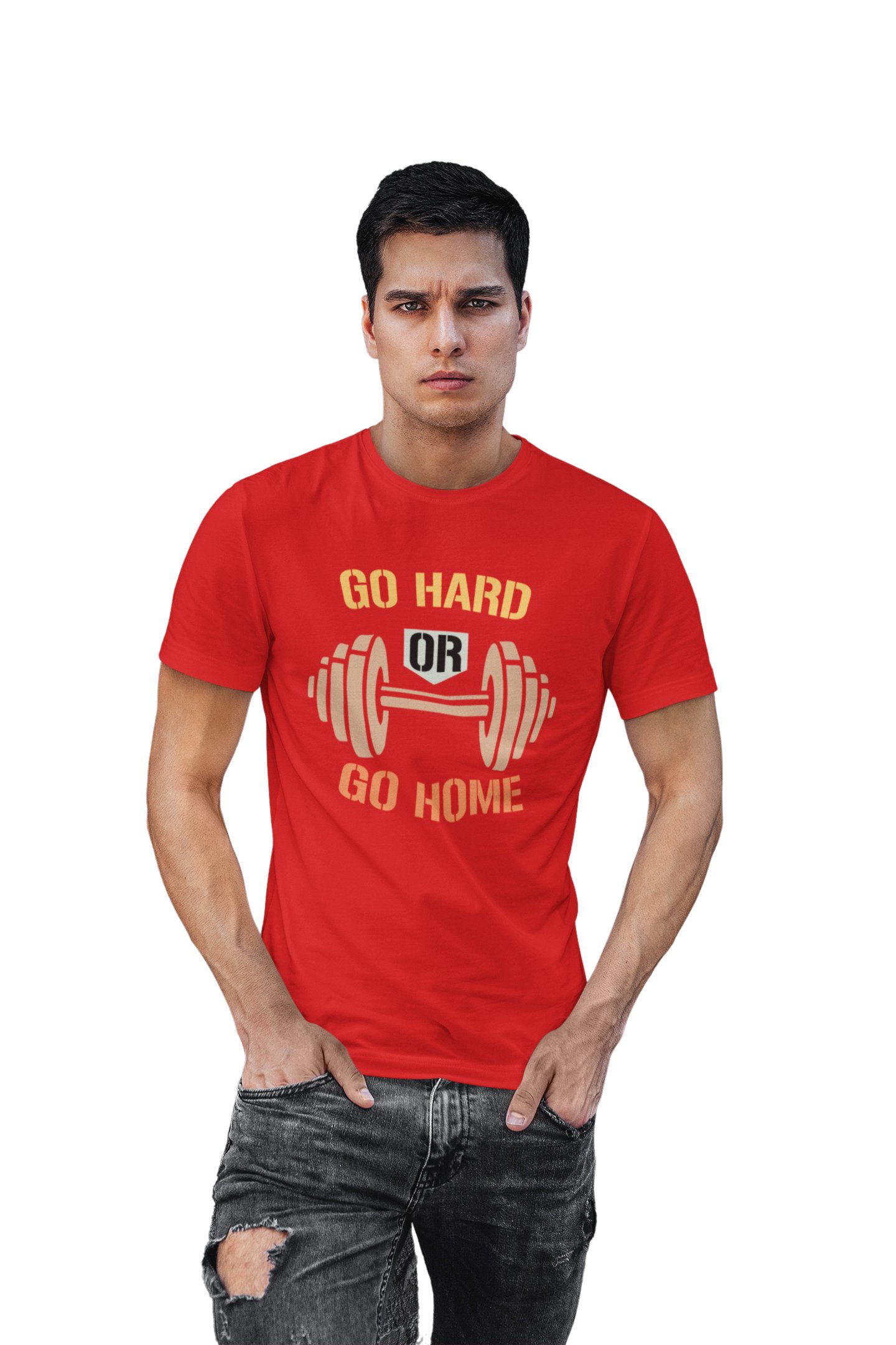 Go Hard Or Go Home, (BG Yellow, Orange, Black and Brown), Round Neck Gym Tshirt (Red Tshirt) - Clothes for Gym Lovers - Foremost Gifting Material for Your Friends and Close Ones