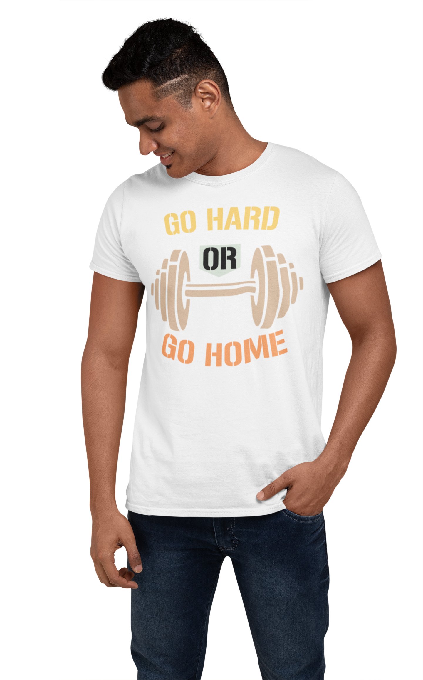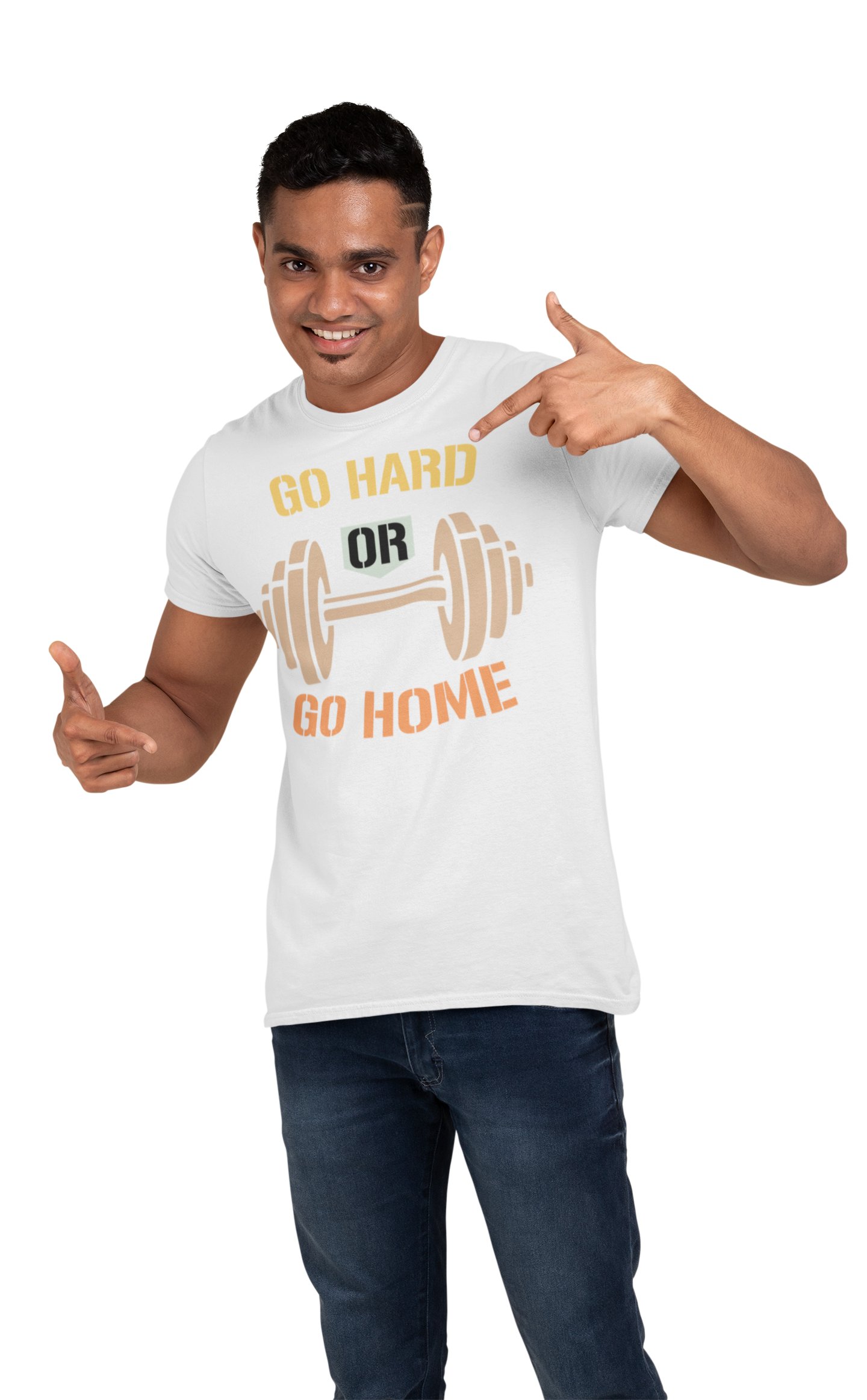 Go Hard Or Go Home, (BG Yellow, Orange, Black and Brown), Round Neck Gym Tshirt (White Tshirt) - Clothes for Gym Lovers - Suitable for Gym Going Person - Foremost Gifting Material for Your Friends and Close Ones