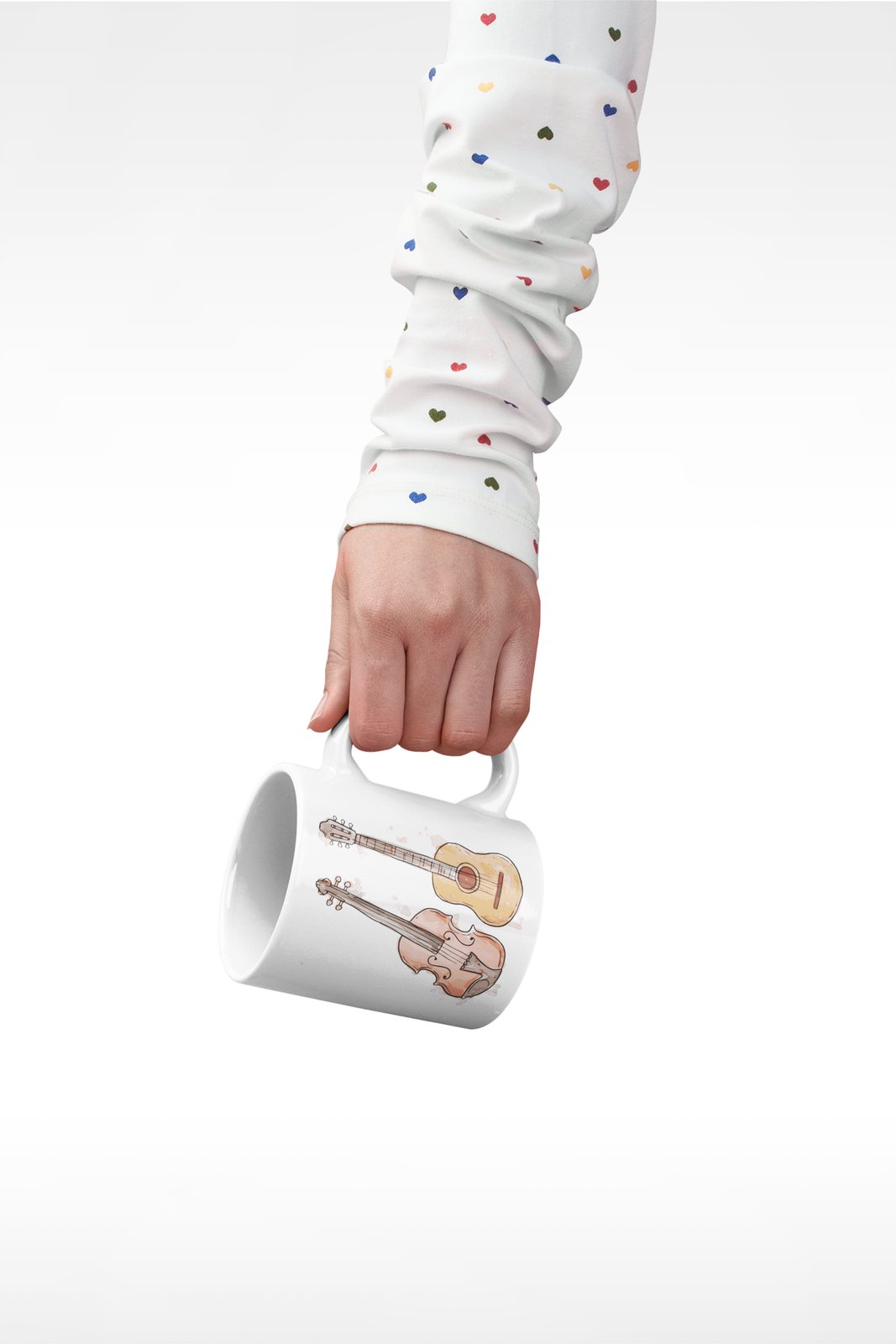 Guitar and violin - music themed printed ceramic white coffee and tea mugs/ cups for music lovers