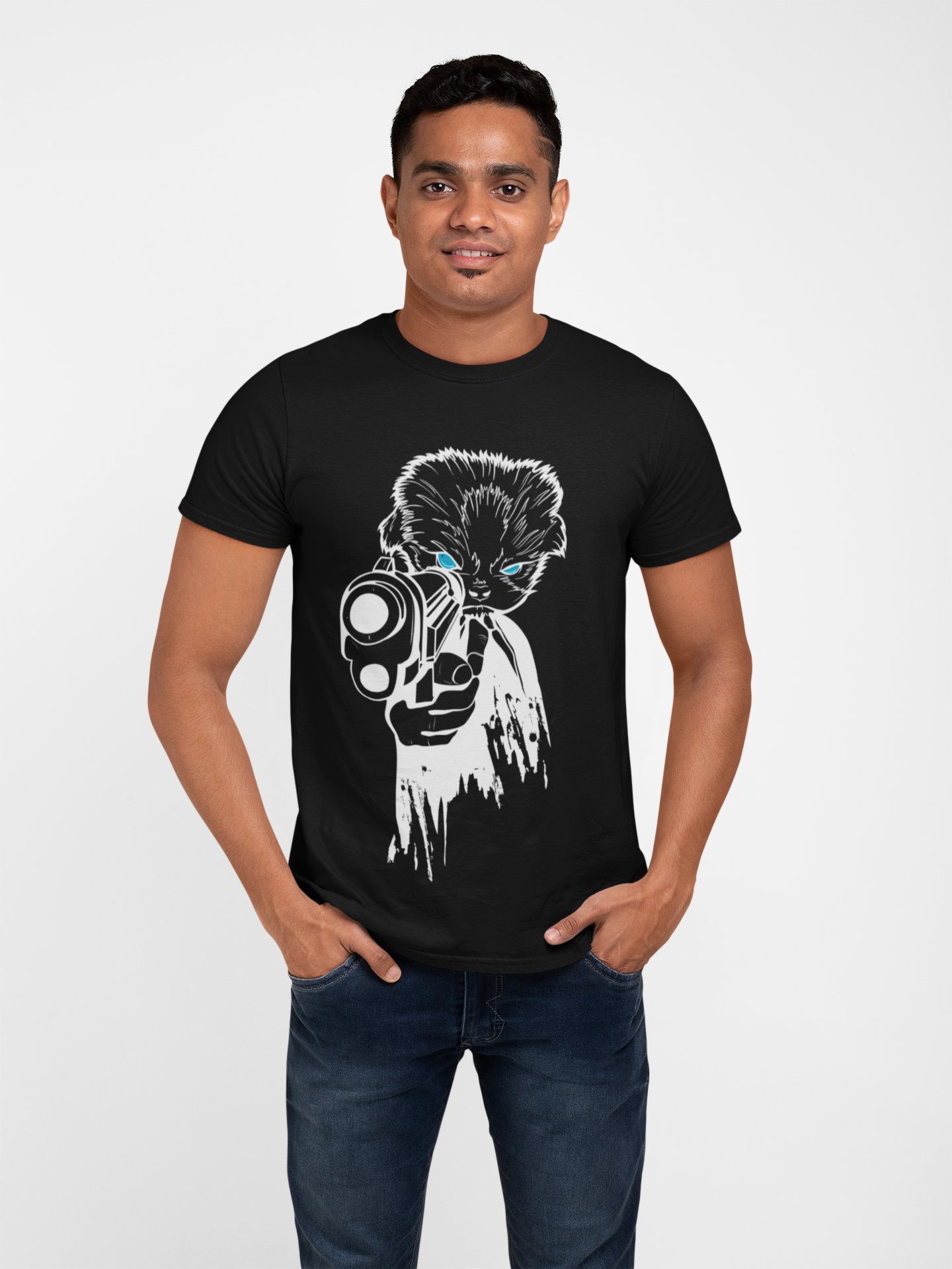 Cat with gun - White - printed T-shirts - Men's stylish clothing - Cool tees for boysscary