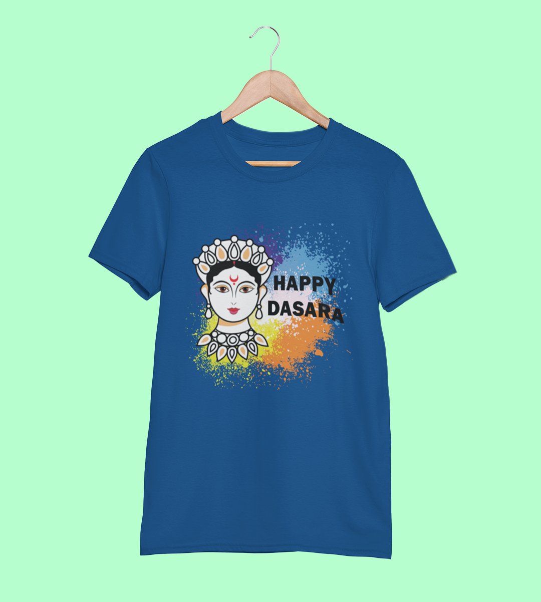 Happy Dasara (BG white) printed unisex adults round neck cotton half-sleeve blue tshirt specially for Navratri festival/ Durga puja