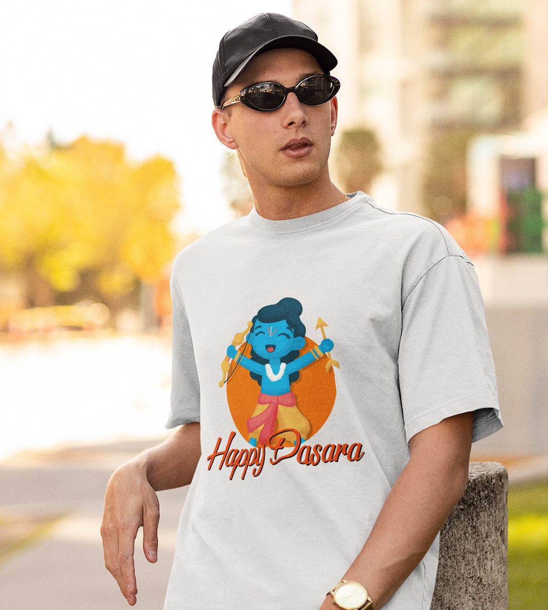 Happy Dasara printed unisex adults round neck cotton half-sleeve white tshirt specially for Navratri festival/ Durga puja