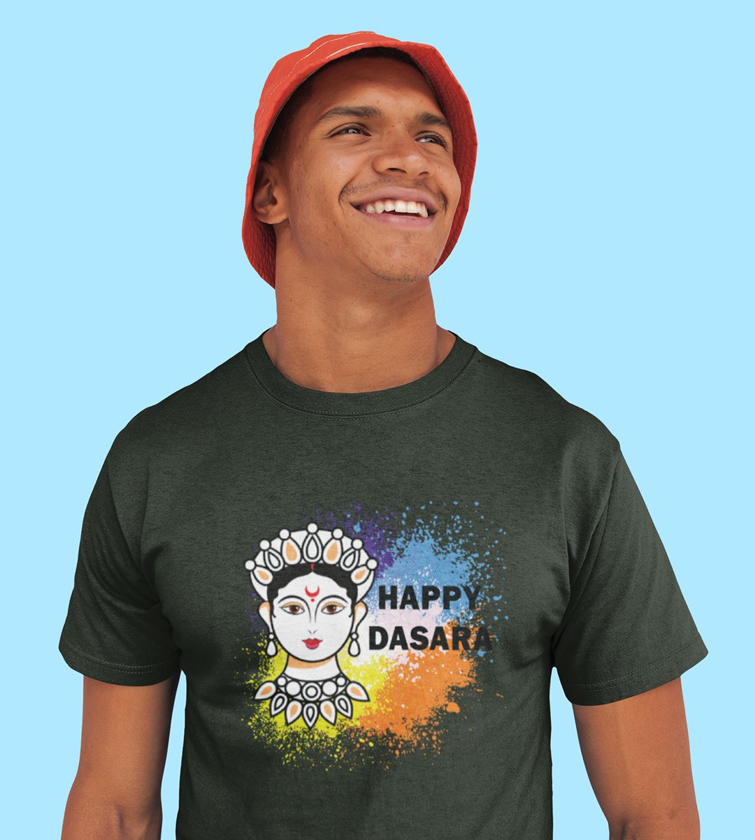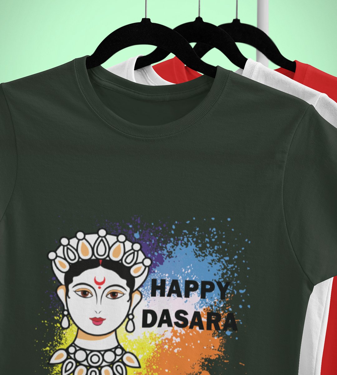 Happy dasara text printed unisex adults round neck cotton half-sleeve green tshirt specially for Navratri festival/ Durga puja