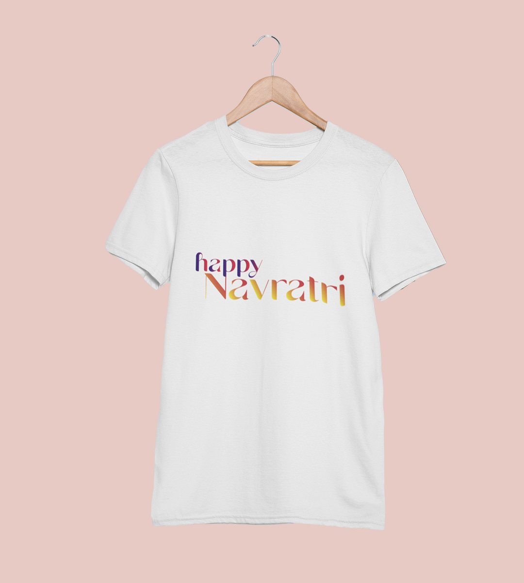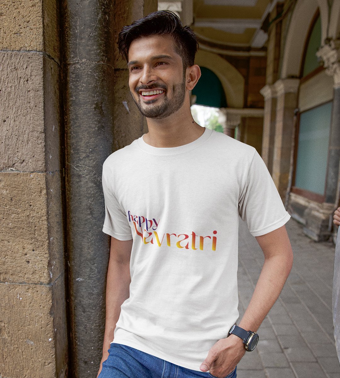 Happy Navratri (colourful text) printed unisex adults round neck cotton half-sleeve white tshirt specially for Navratri festival/ Durga puja