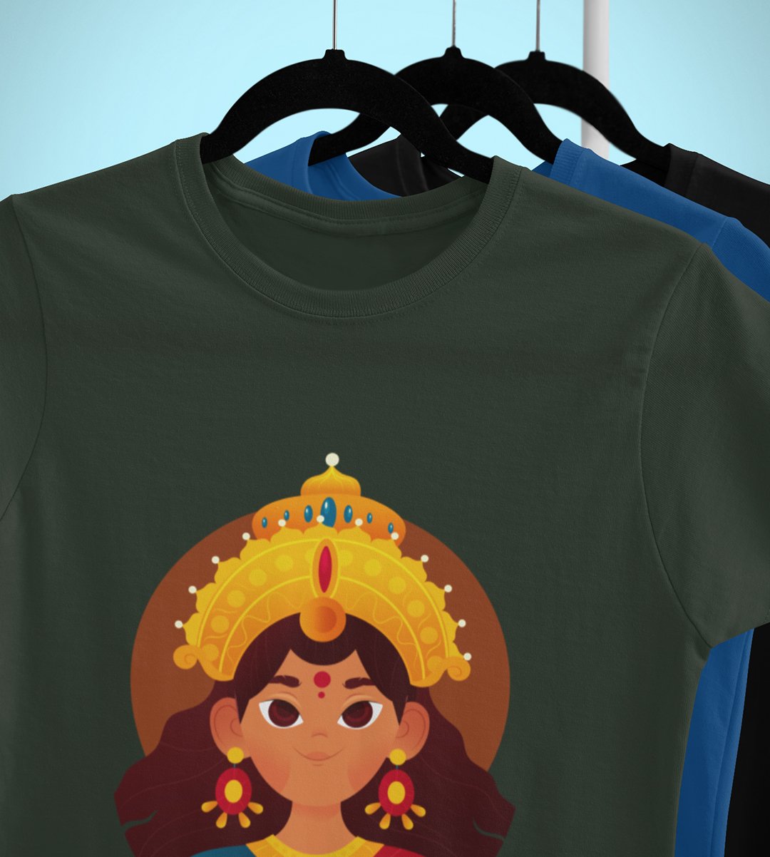 Navratri is a very auspicious festival for hindus. It takes place at the beginning of October and sometimes September. Enjoy the 9 days of festivities with full zeal and make yourself submerged in the love of Maa Durga. Navratri is also known as Durga Puja. And with this Tees, you can shine like a star during this festive season with our navratri themed cotton half sleeved Tshirts. You can pair our t-shirts with trousers and denim of your choice and make it a weekday smart casual or weekend wear. This is durable. This tshirt is smooth and soft which makes you comfortable to wear during all seasons. The printing in it is durable and odourless. It has five sizes, S,M,L,XL,XXL. The Tshirt colour is intact even after repeated washes. It can be kept in your wardrobe and hangers. Please avoid washing mashine to clean this Tee, it may affect the print. Hand wash only. We have brought you many navratri related designs printed on our different colour Tshirts to choose from. Grab it now.