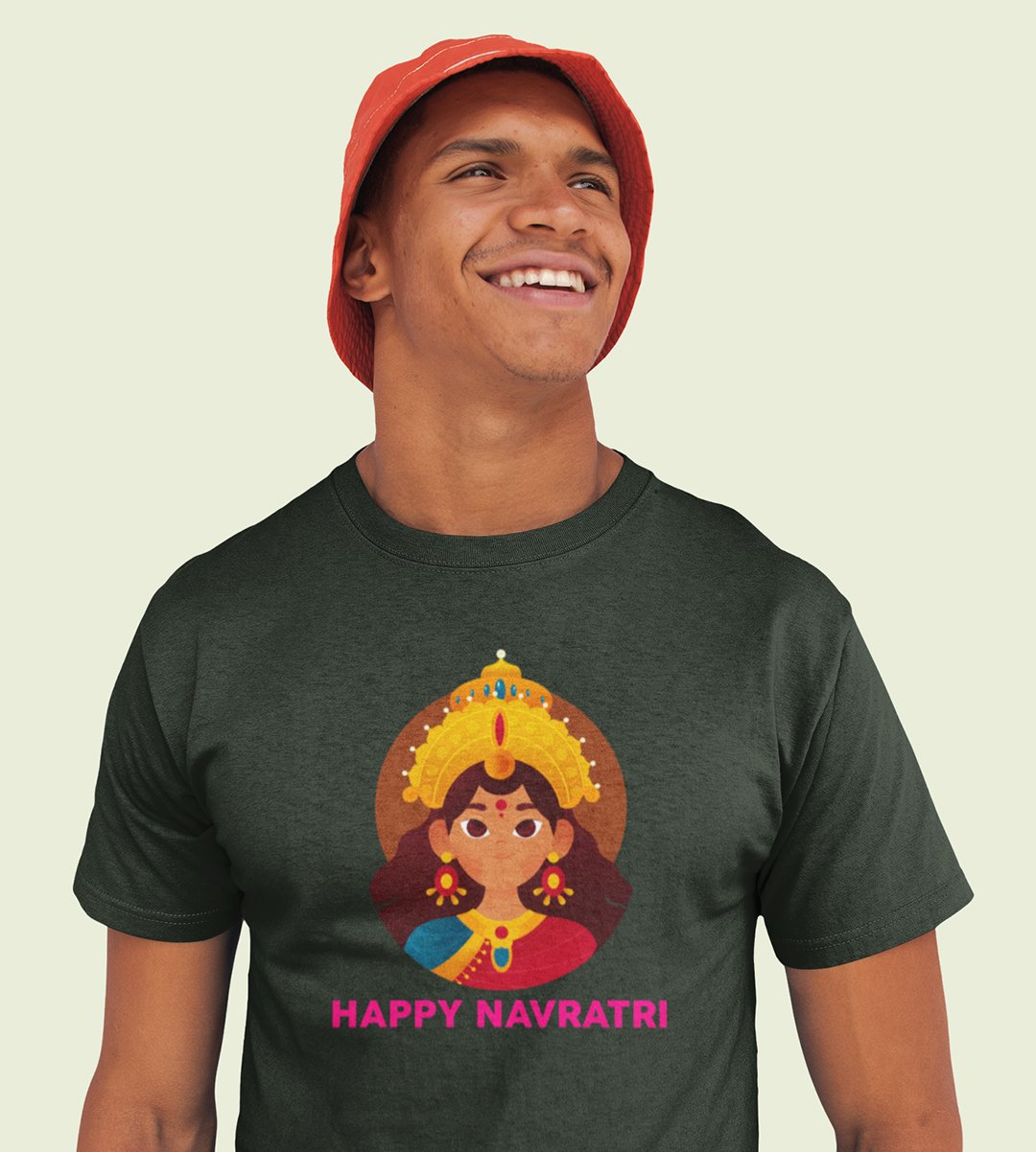 Happy Navratri (Durga ma face) printed unisex adults round neck cotton half-sleeve green tshirt specially for Navratri festival/ Durga puja