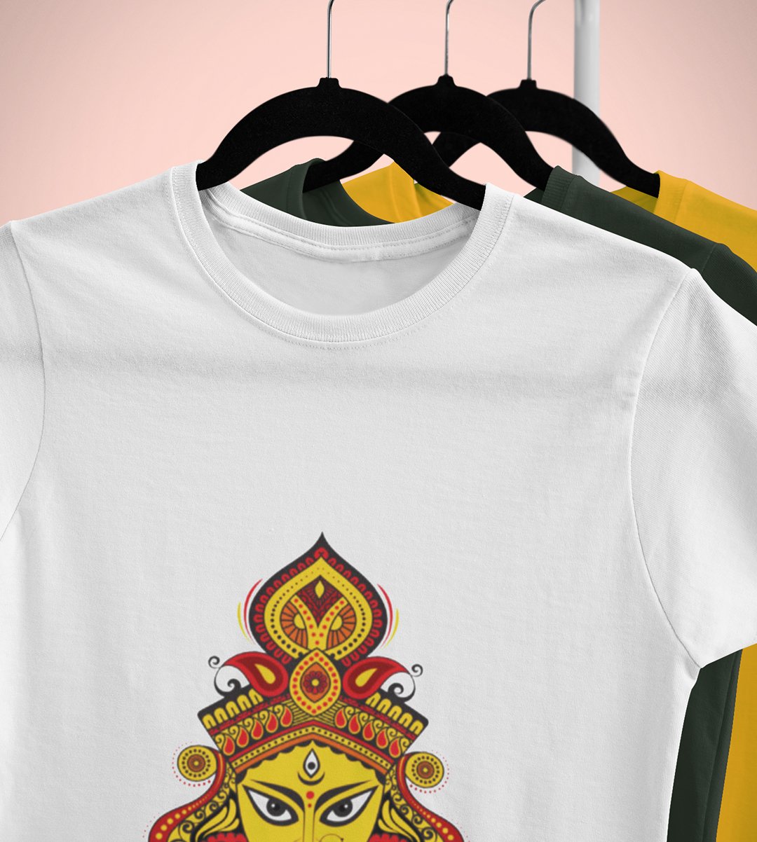 Navratri is a very auspicious festival for hindus. It takes place at the beginning of October and sometimes September. Enjoy the 9 days of festivities with full zeal and make yourself submerged in the love of Maa Durga. Navratri is also known as Durga Puja. And with this Tees, you can shine like a star during this festive season with our navratri themed cotton half sleeved Tshirts. You can pair our t-shirts with trousers and denim of your choice and make it a weekday smart casual or weekend wear. This is durable. This tshirt is smooth and soft which makes you comfortable to wear during all seasons. The printing in it is durable and odourless. It has five sizes, S,M,L,XL,XXL. The Tshirt colour is intact even after repeated washes. It can be kept in your wardrobe and hangers. Please avoid washing mashine to clean this Tee, it may affect the print. Hand wash only. We have brought you many navratri related designs printed on our different colour Tshirts to choose from. Grab it now.