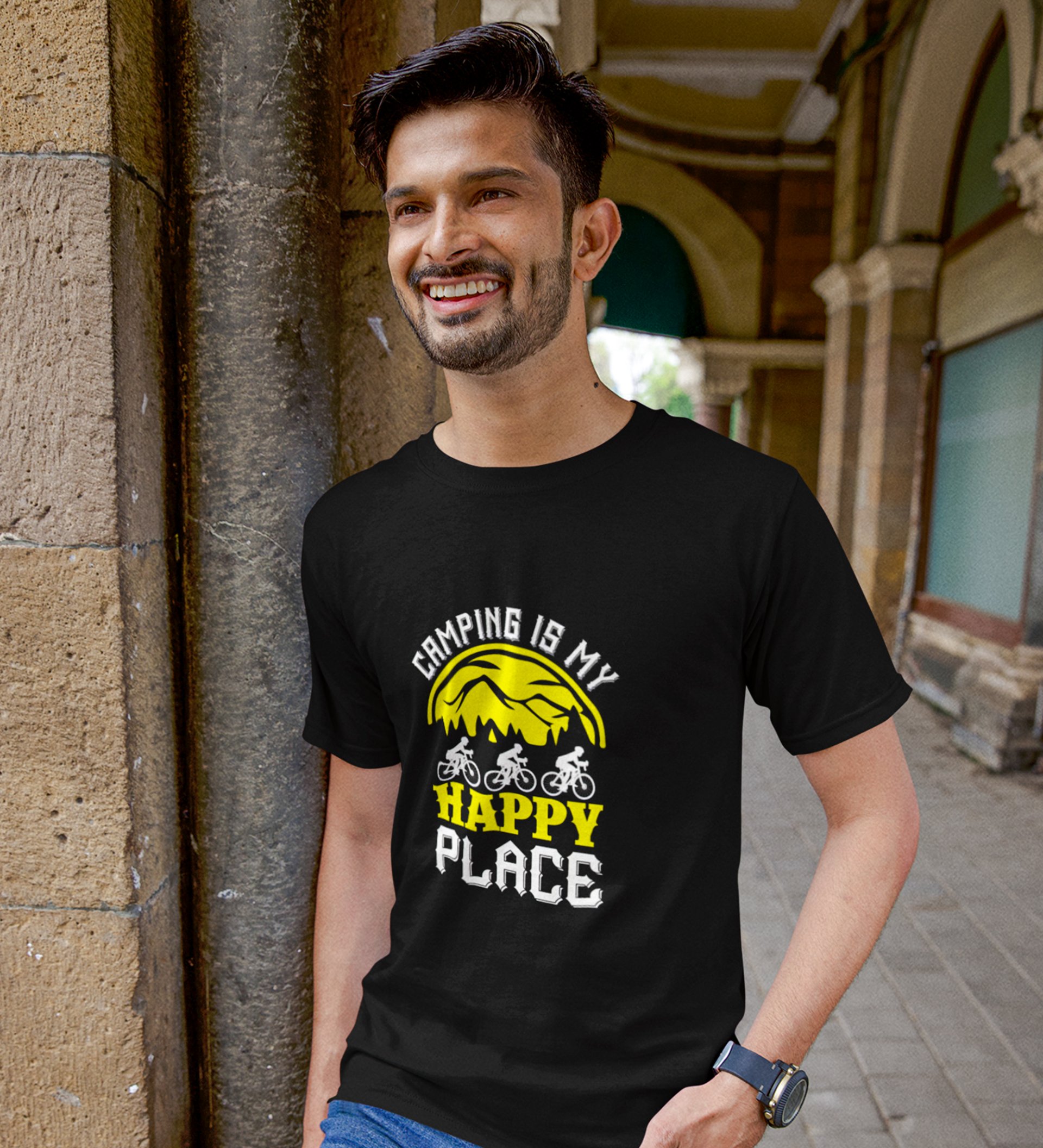 JD.TRENDS Camping- My Happy Place Black Round Neck Cotton Half Sleeved Men's T-Shirt with Printed Graphics