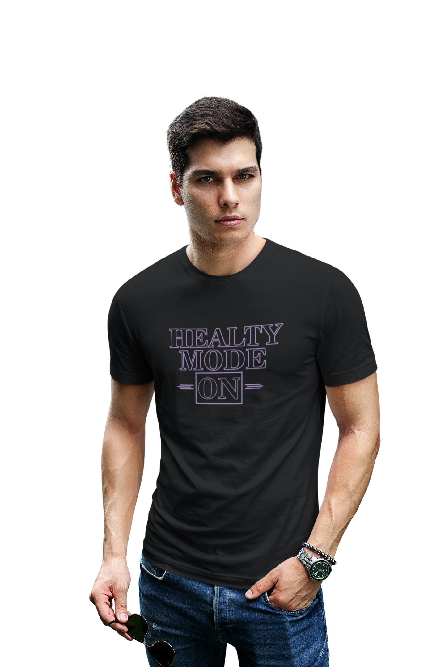Healthy Mode On, (BG Violet), On Round Neck Gym Tshirt (Black Tshirt) - Clothes for Gym Lovers - Suitable for Gym Going Person - Foremost Gifting Material for Your Friends and Close Ones