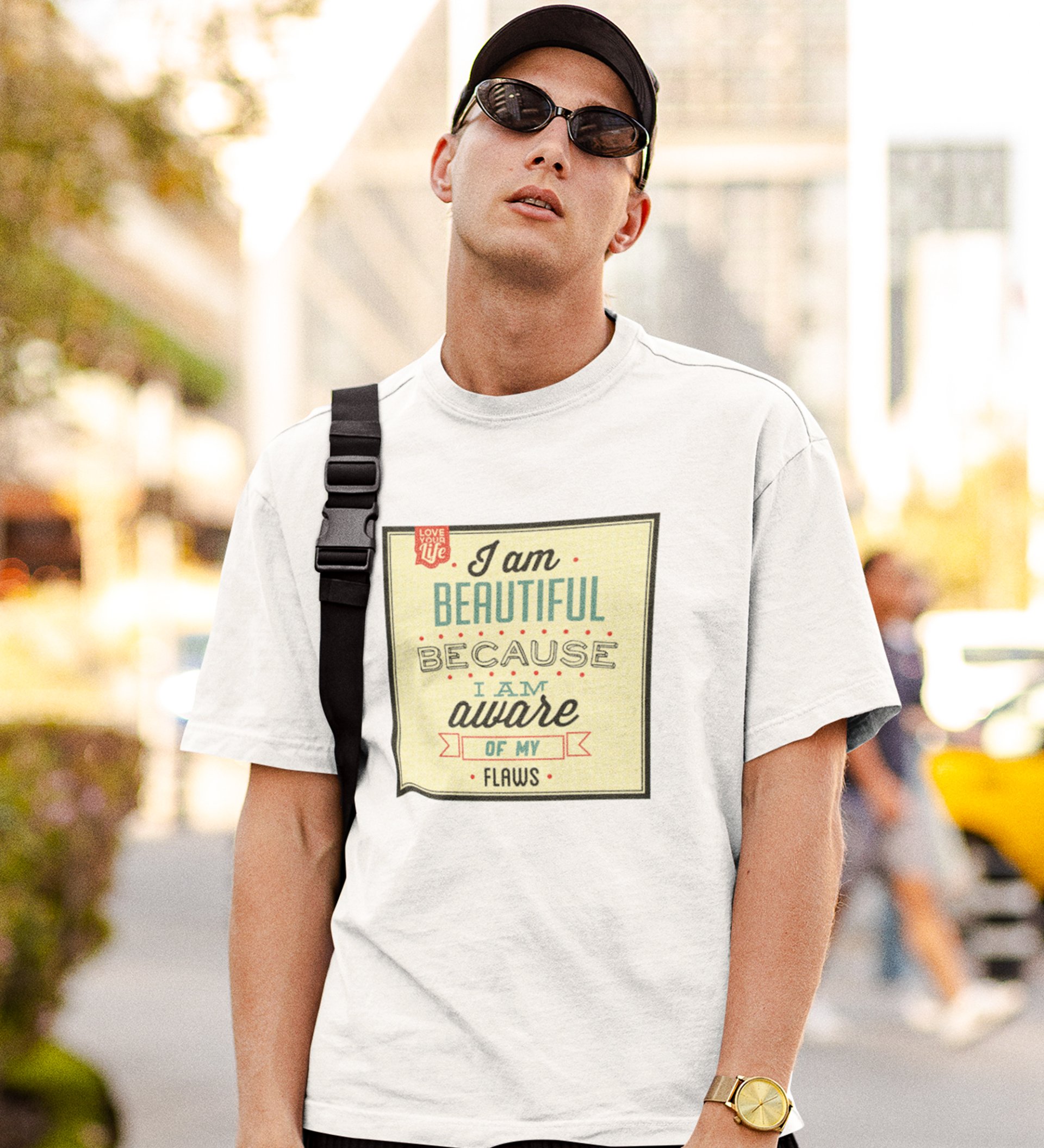 Flaws Are Beauty White Round Neck Cotton Half Sleeved Men's T-Shirt with Printed Graphics