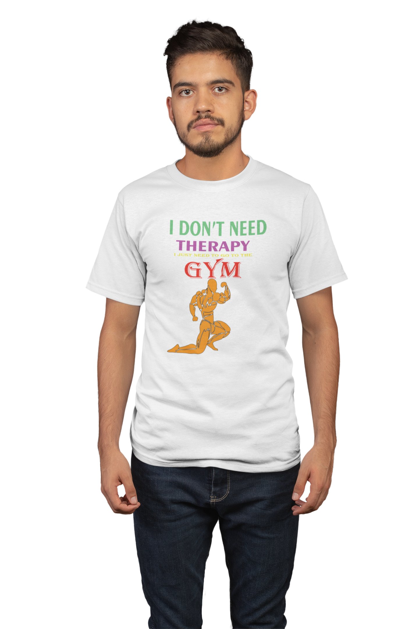I Don't Need Therapy, I Just Need To Go To The Gym, Men Posing, Gym Blended Tshirt (White Tshirt) - Clothes for Gym Lovers - Foremost Gifting Material for Your Friends and Close Ones