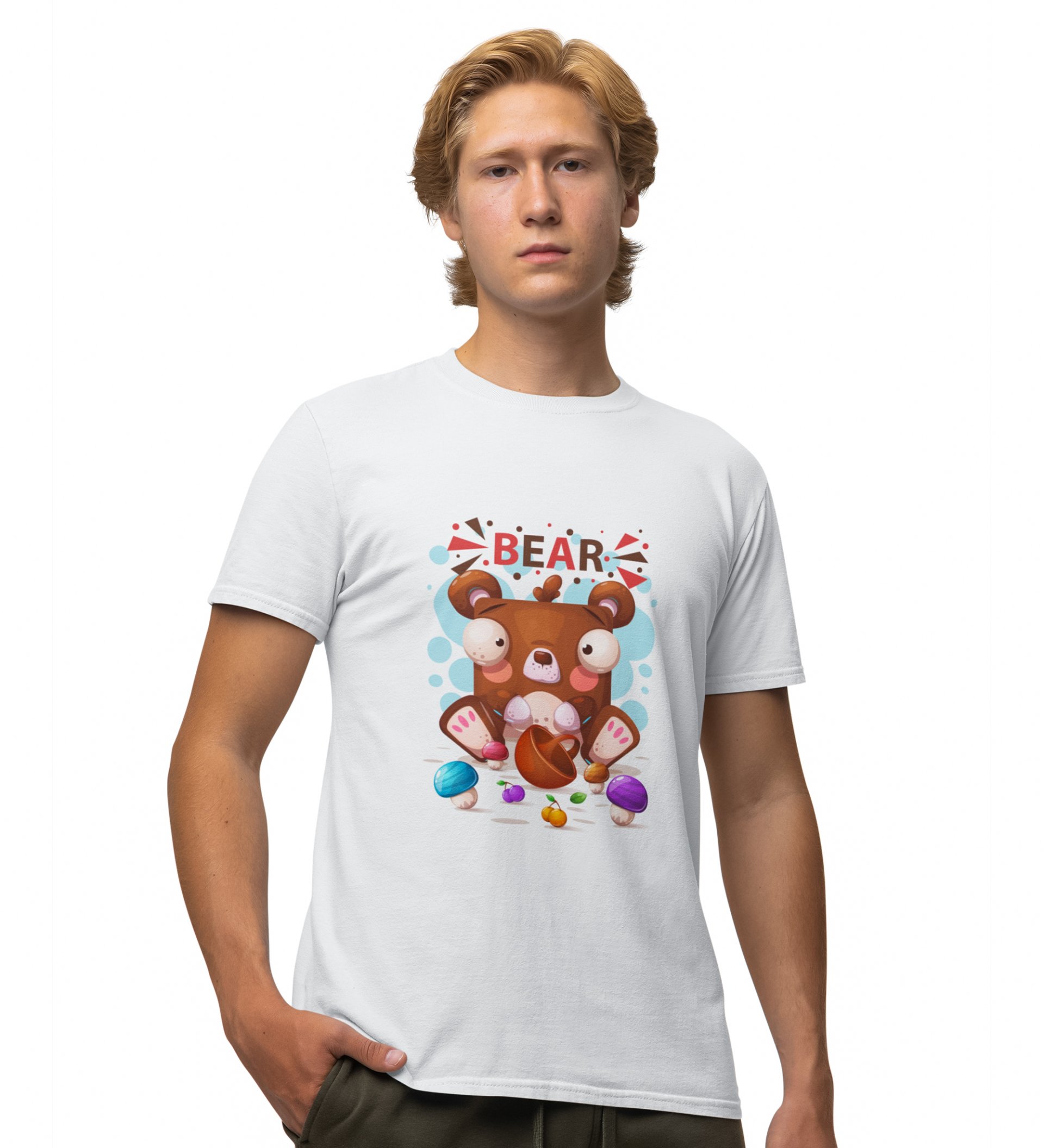 The Fruity Bear White Round Neck Cotton Half Sleeved Men's T-Shirt with Printed Graphics