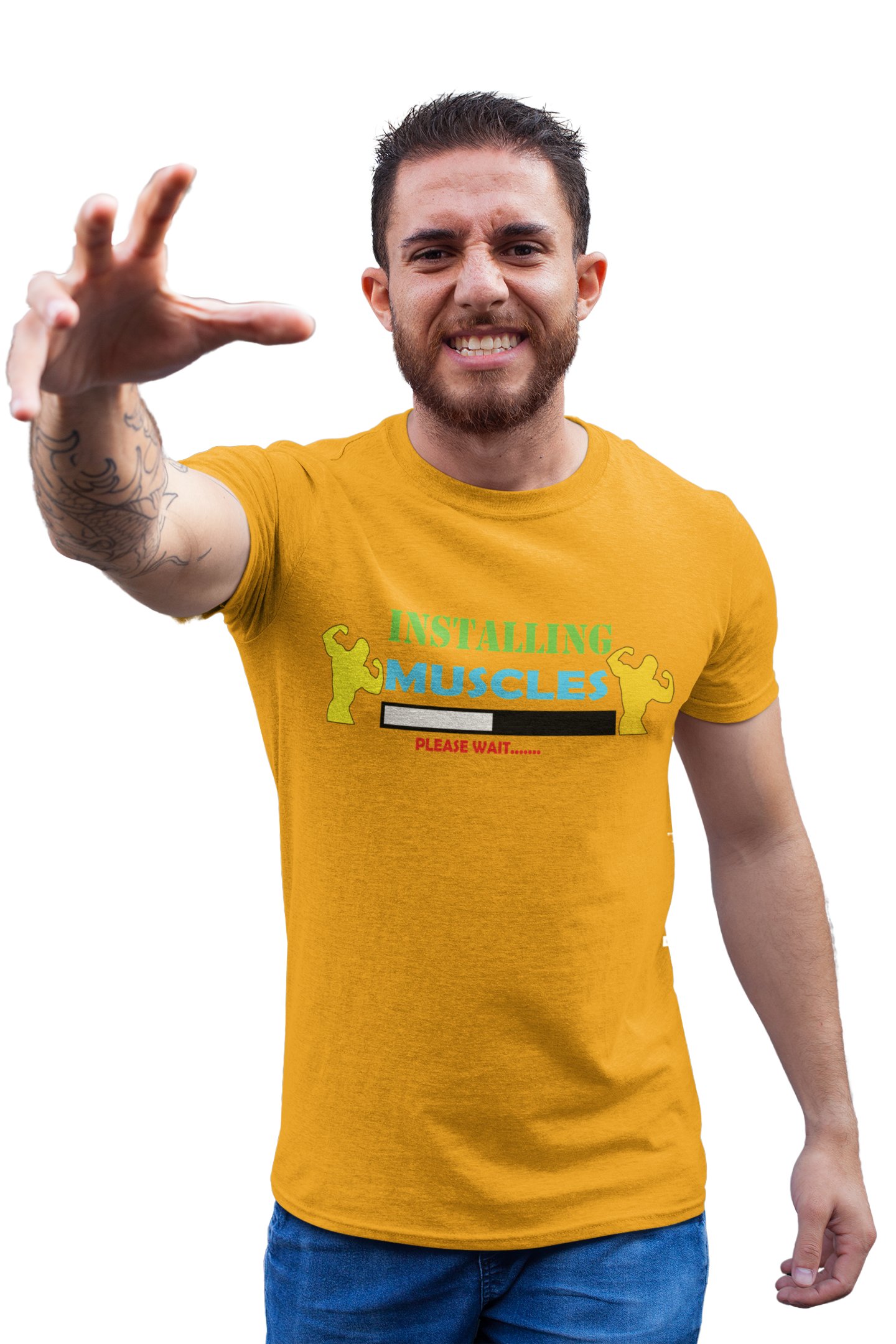 Installing Muscles, Please Wait, Round Neck Gym Tshirt (Yellow Tshirt) - Clothes for Gym Lovers - Suitable for Gym Going Person - Foremost Gifting Material for Your Friends and Close Ones