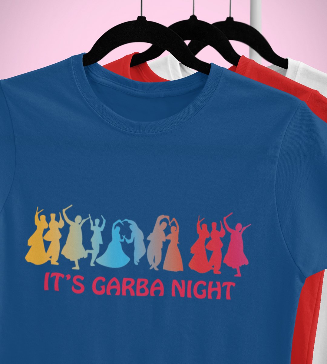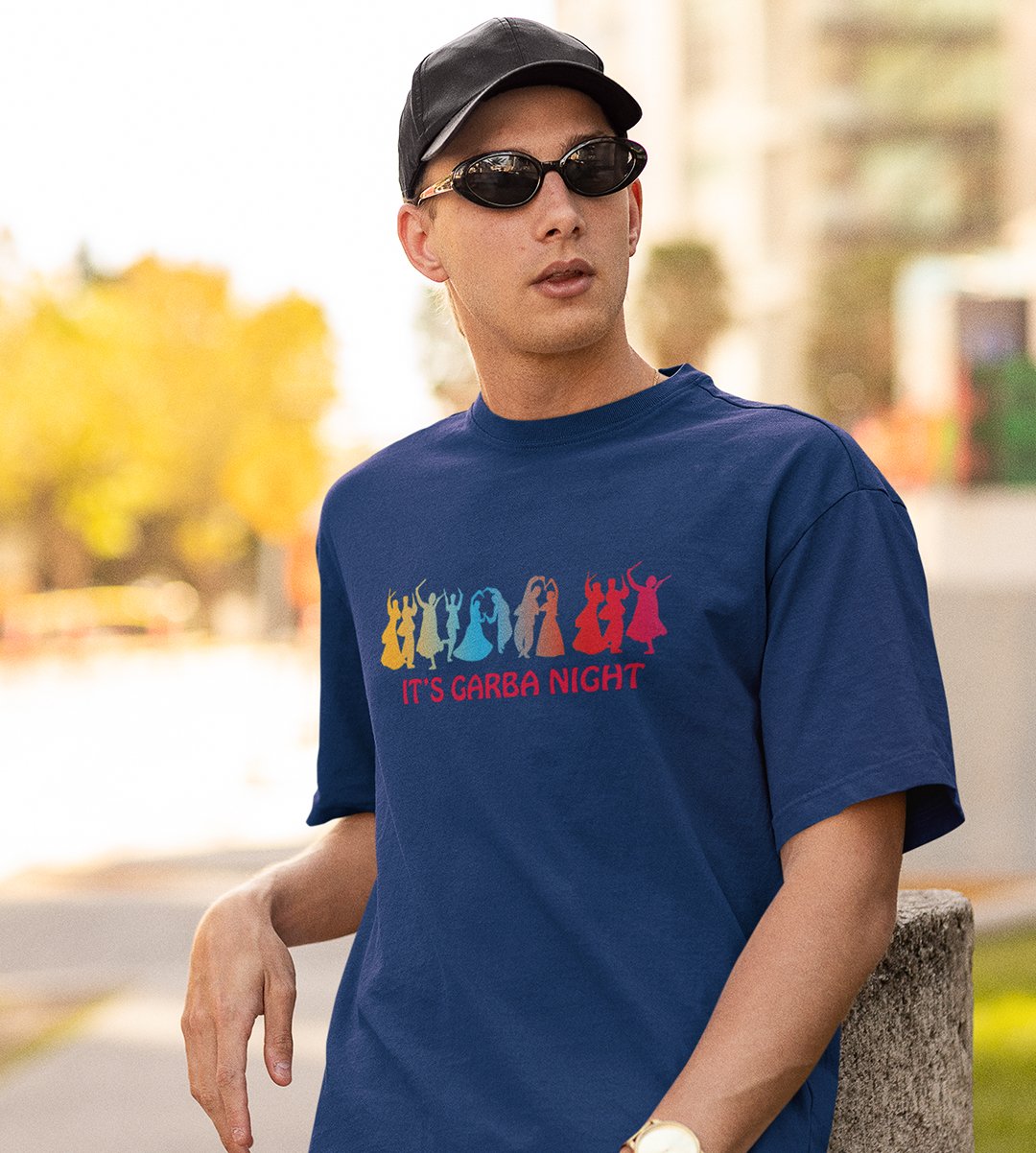 It's garba night printed unisex adults round neck cotton half-sleeve blue tshirt specially for Navratri festival/ Durga puja