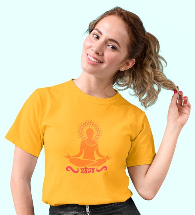 Just Yoga Yellow Round Neck Cotton Half Sleeved Women T-Shirt with Printed Graphics