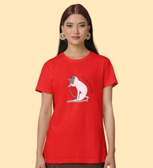 Keep Calm And Do Yoga Red Round Neck Cotton Half Sleeved Women T-Shirt with Printed Graphics