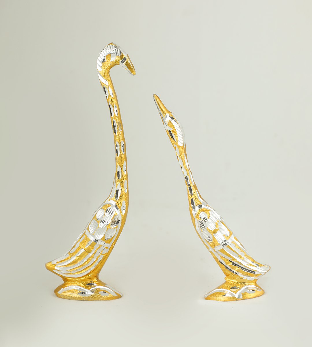 This love swan pair is made up of good quality metal brass finish and the pair looks attractive with a shiny golden color and is quite durable. It is light weight and can be kept anywhere to bring in love and luck. As per the science of Feng Shui. Add an element of beauty to your home decor. It can also be an ideal addition to your living room. Use clean and dry cloth to clean the product. It could be a memorable gift to your wedding, house warming, anniversary, birthdays or festive occasions, it can be a memorable return gift. What can be a better gift than a handcrafted antique metal couple swan statues for your loved ones? What are you waiting for? Grab it now.