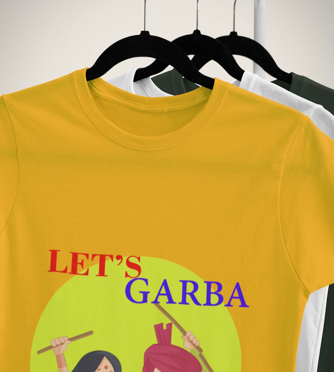 Let's garba printed unisex adults round neck cotton half-sleeve yellow tshirt specially for Navratri festival/ Durga puja