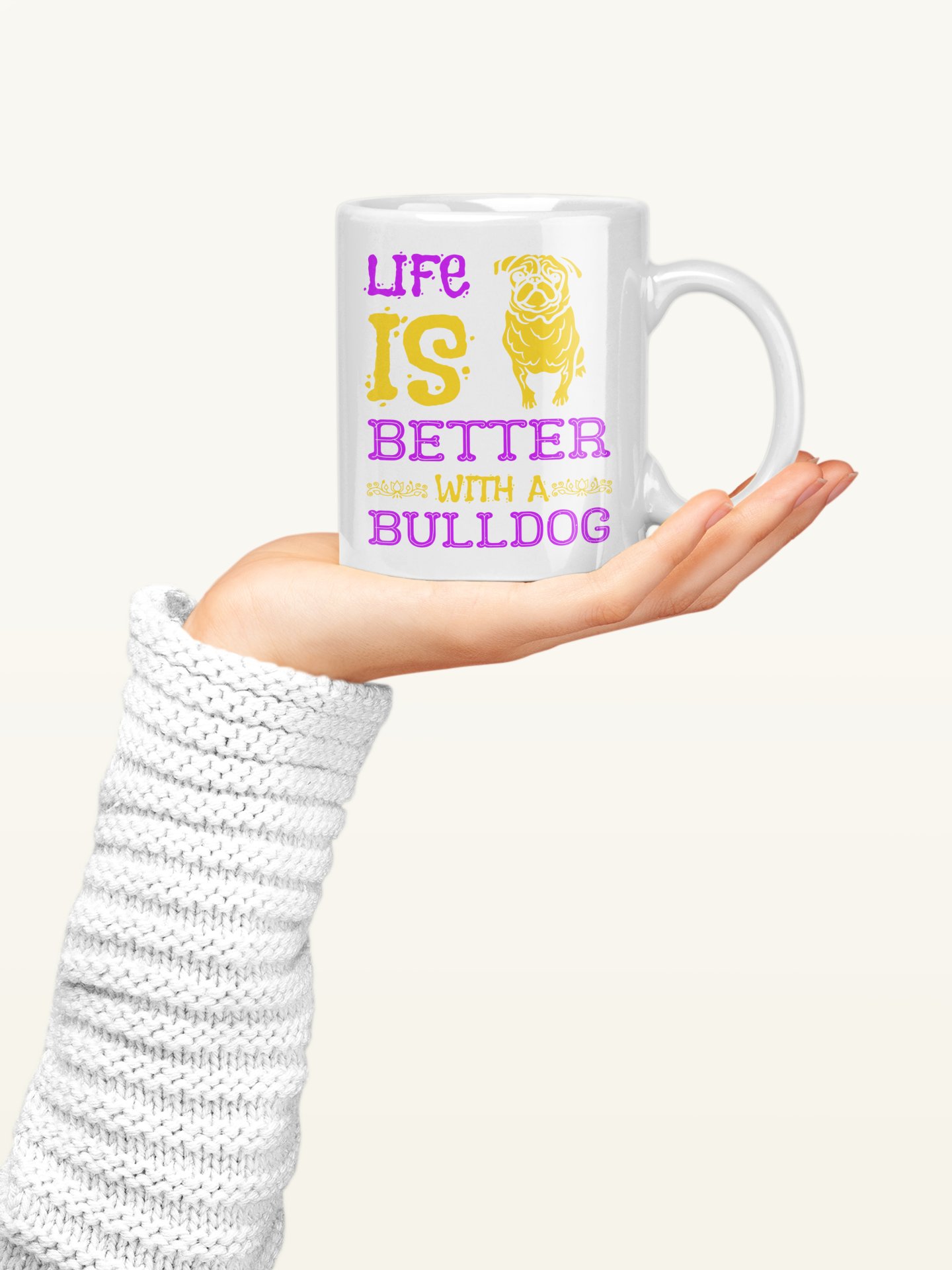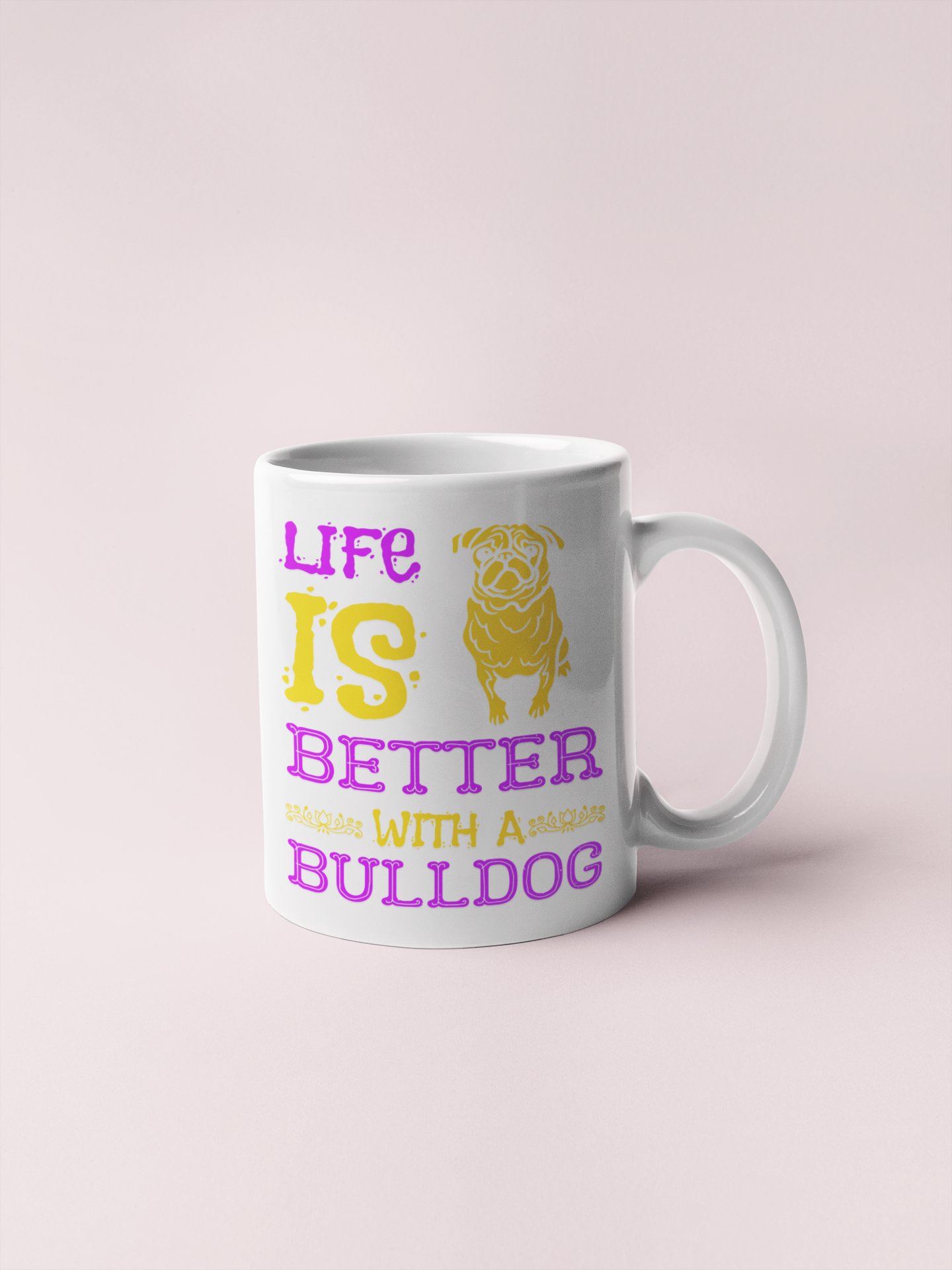 Life is better with a bulldog - pets themed printed ceramic white coffee and tea mugs/ cups for pets lover people
