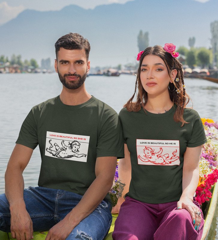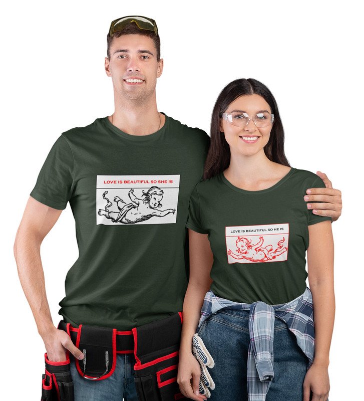 Love Is Beautiful So She Is/ Love Is Beautiful So He Is, Printed (green) T-shirts For Couples