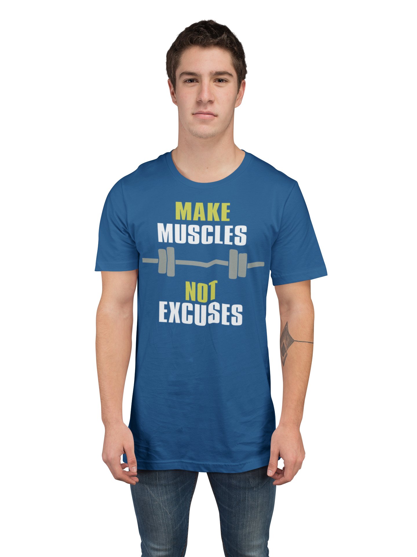 Make Muscles, Not Excuses, (BG White and Green), Round Neck Gym Tshirt (Blue Tshirt) - Clothes for Gym Lovers - Suitable for Gym Going Person - Foremost Gifting Material for Your Friends and Close Ones