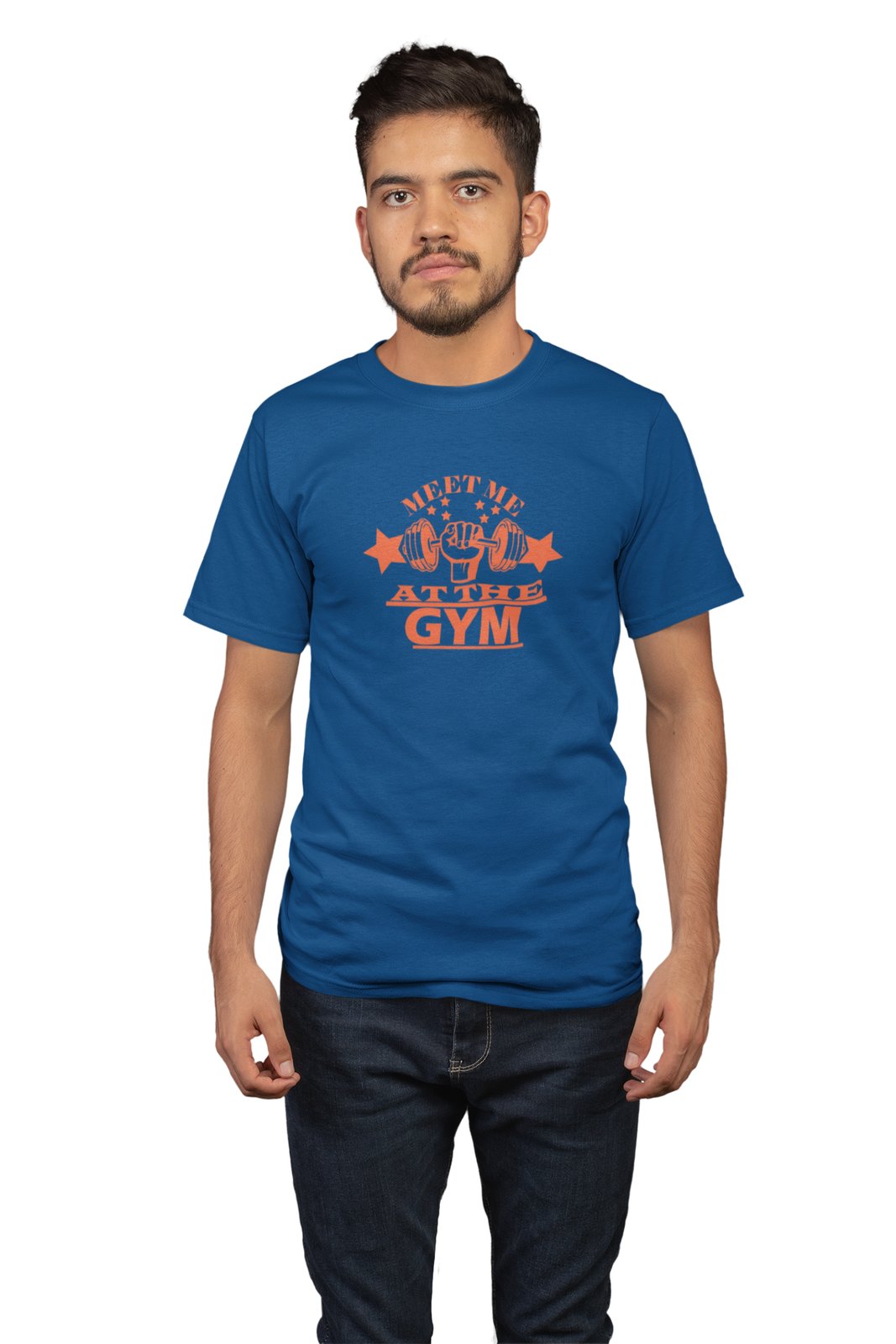 Meet Me At The Gym, (BG Orange), Round Neck Gym Tshirt (Blue Tshirt) - Clothes for Gym Lovers - Suitable for Gym Going Person - Foremost Gifting Material for Your Friends and Close Ones