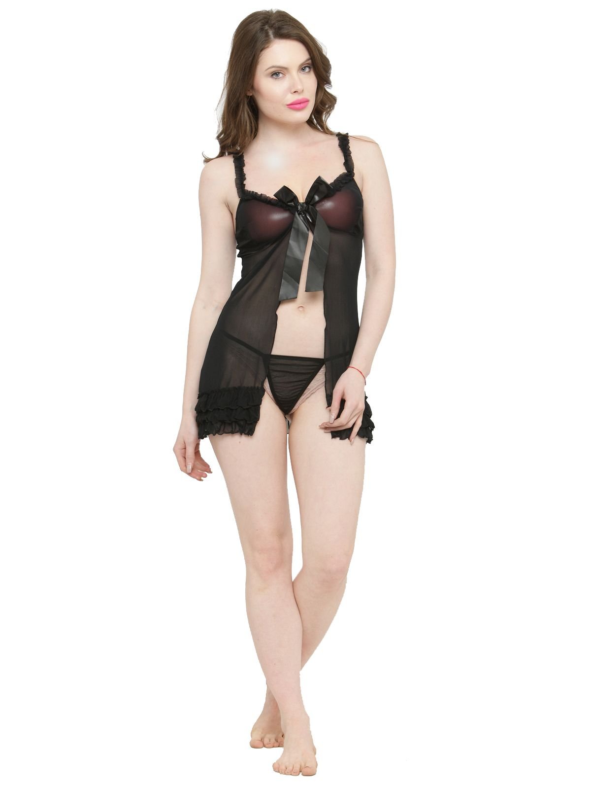 N-Gal Women's Polyester Open Front Sheer Babydoll Dress Nightwear with G-String_Black