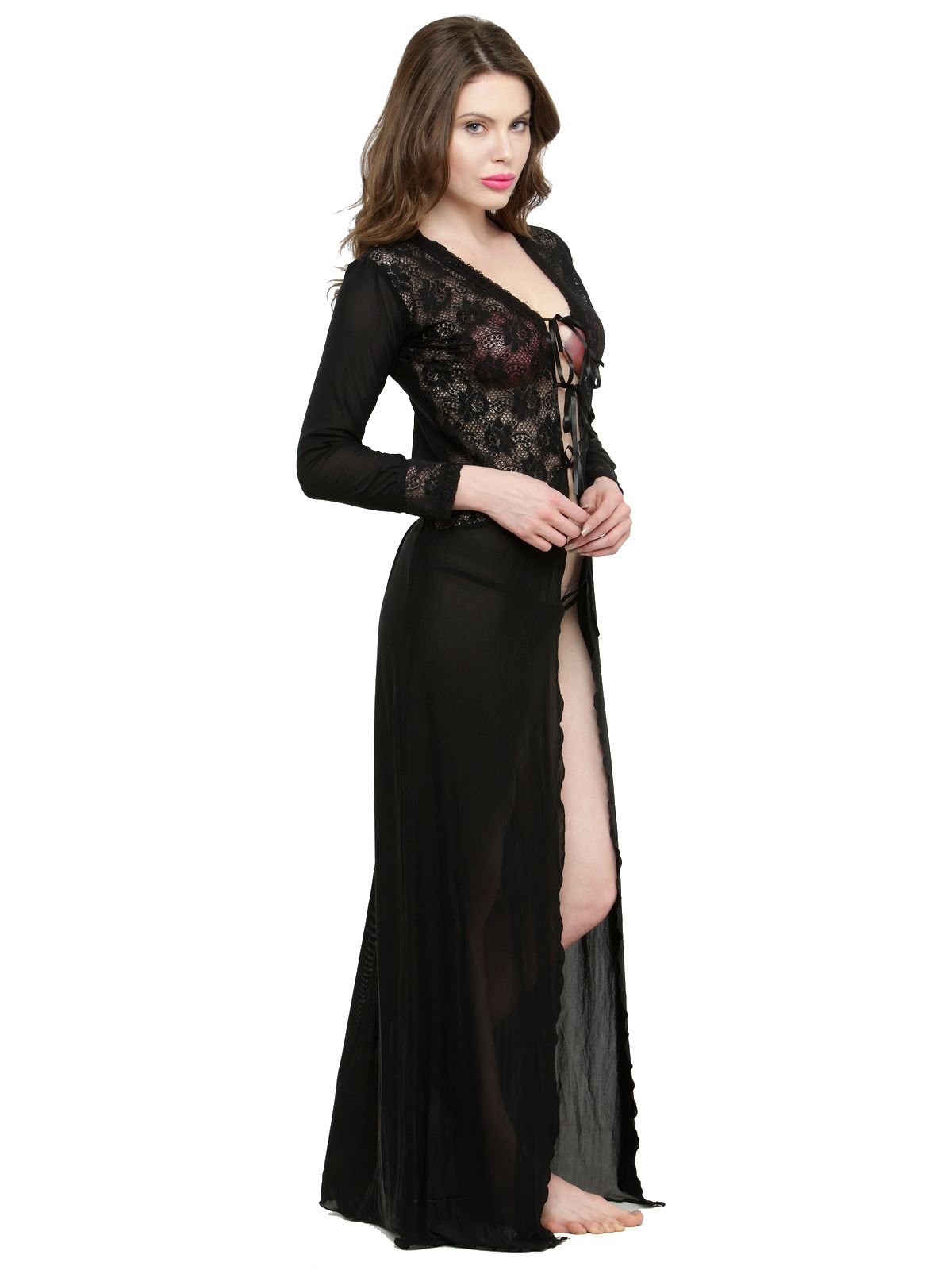 For a well-planned night, this gown is very lovely to make your intimate lover cheer up for your alluring silhouette. this mesh gown with lace detail waistline enhancing you a curve, scalloped lace V-neck on both front and back, flirty split to the thigh and thong matched. Mesh Nightgown Highly Comfortable Includes: Nightgown, G-String