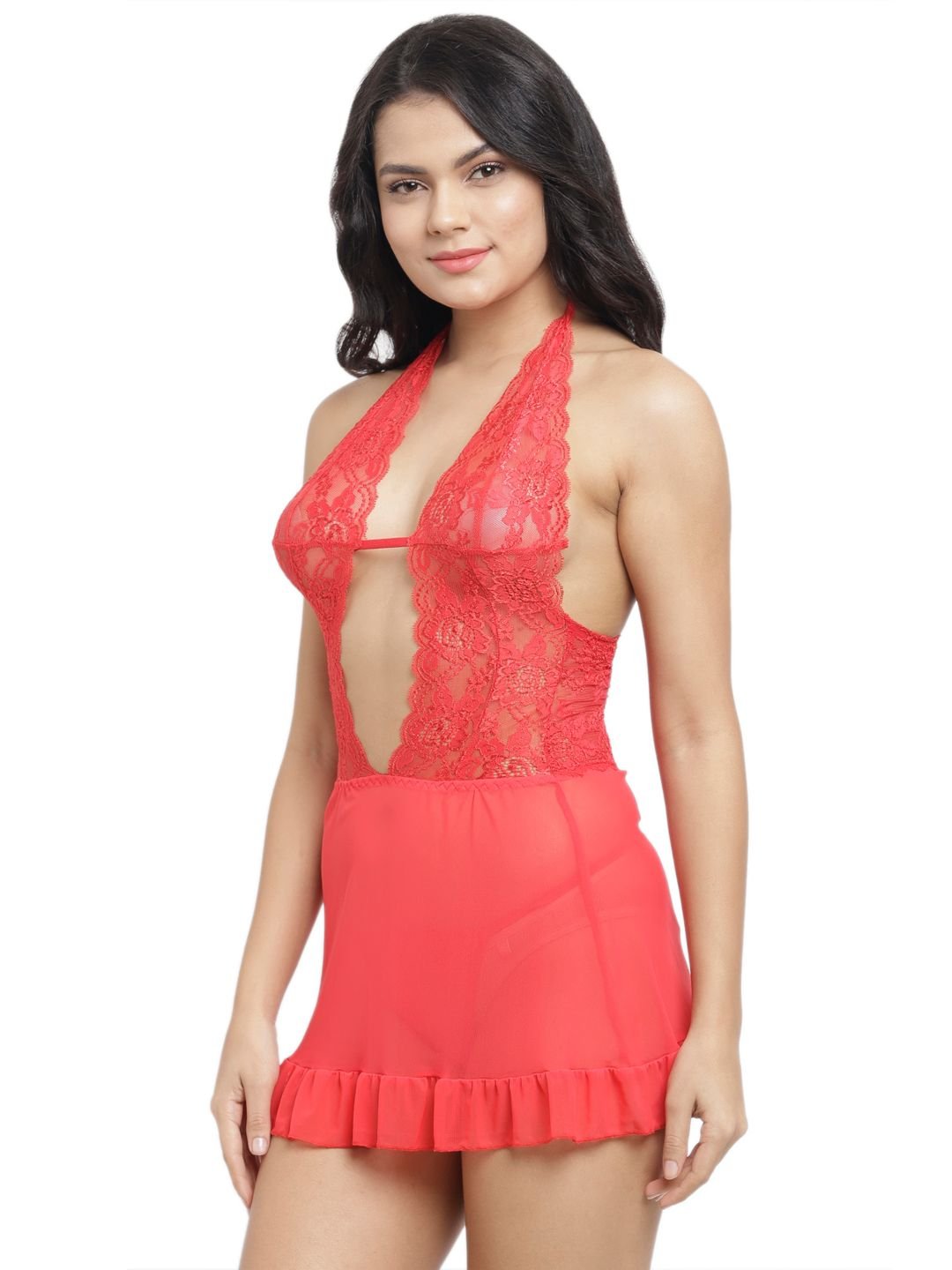 N-Gal Women's Polyester Spandex Front Cut Out Lace Halter Neck Sheer Babydoll Night Dress with G-String_Red