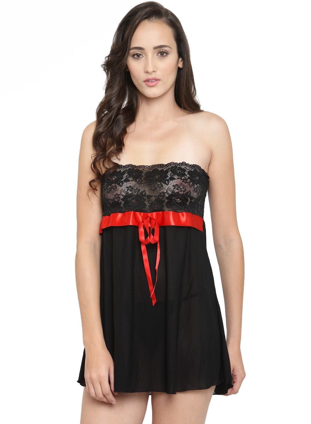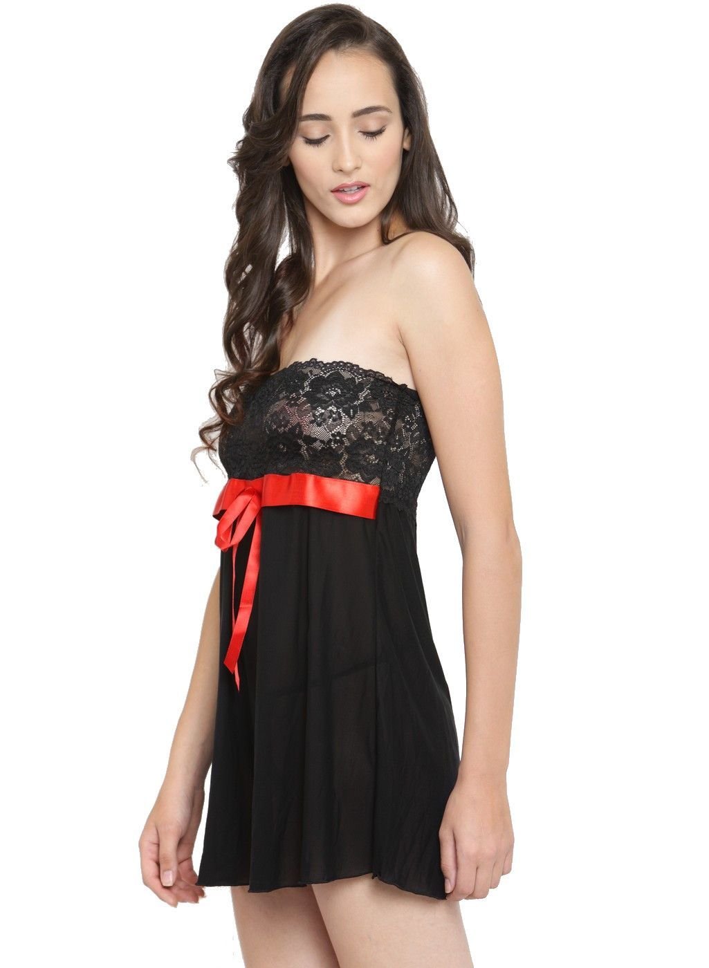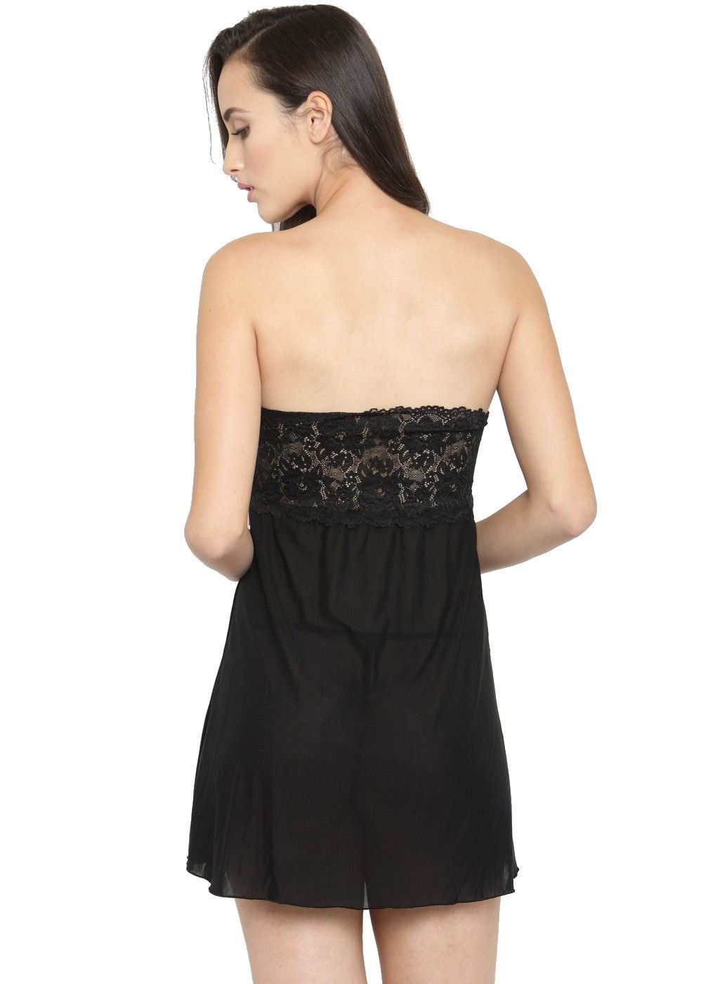 N-Gal Women's Polyester Spandex Strapless Sheer Babydoll Night Dress with G-String_Black