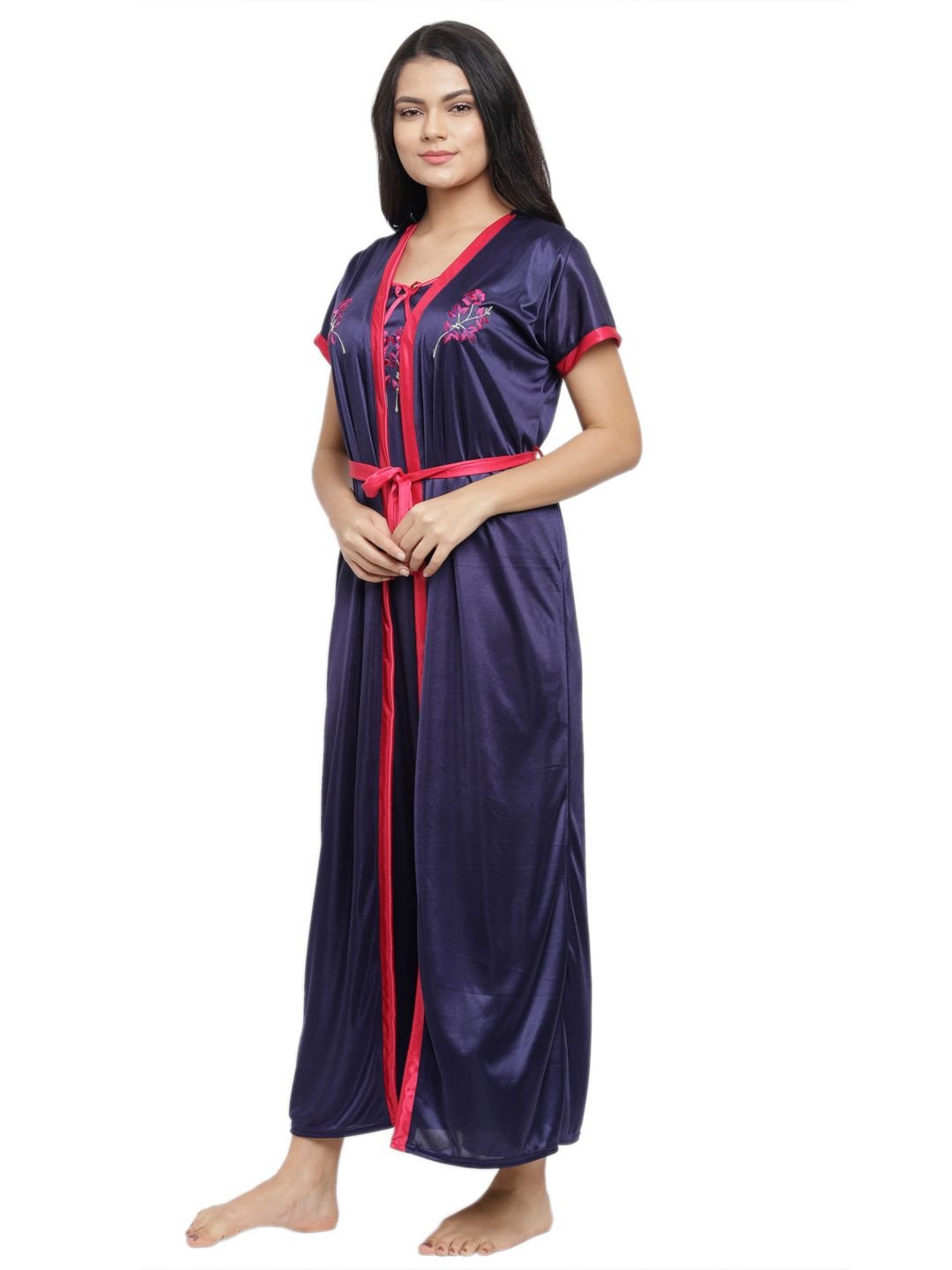 N-Gal Women's Satin Floral Pattern Embroidered Royal Long Nighty Gown with Robe Lingerie 2 Pcs Nightwear Set, NavyBlue