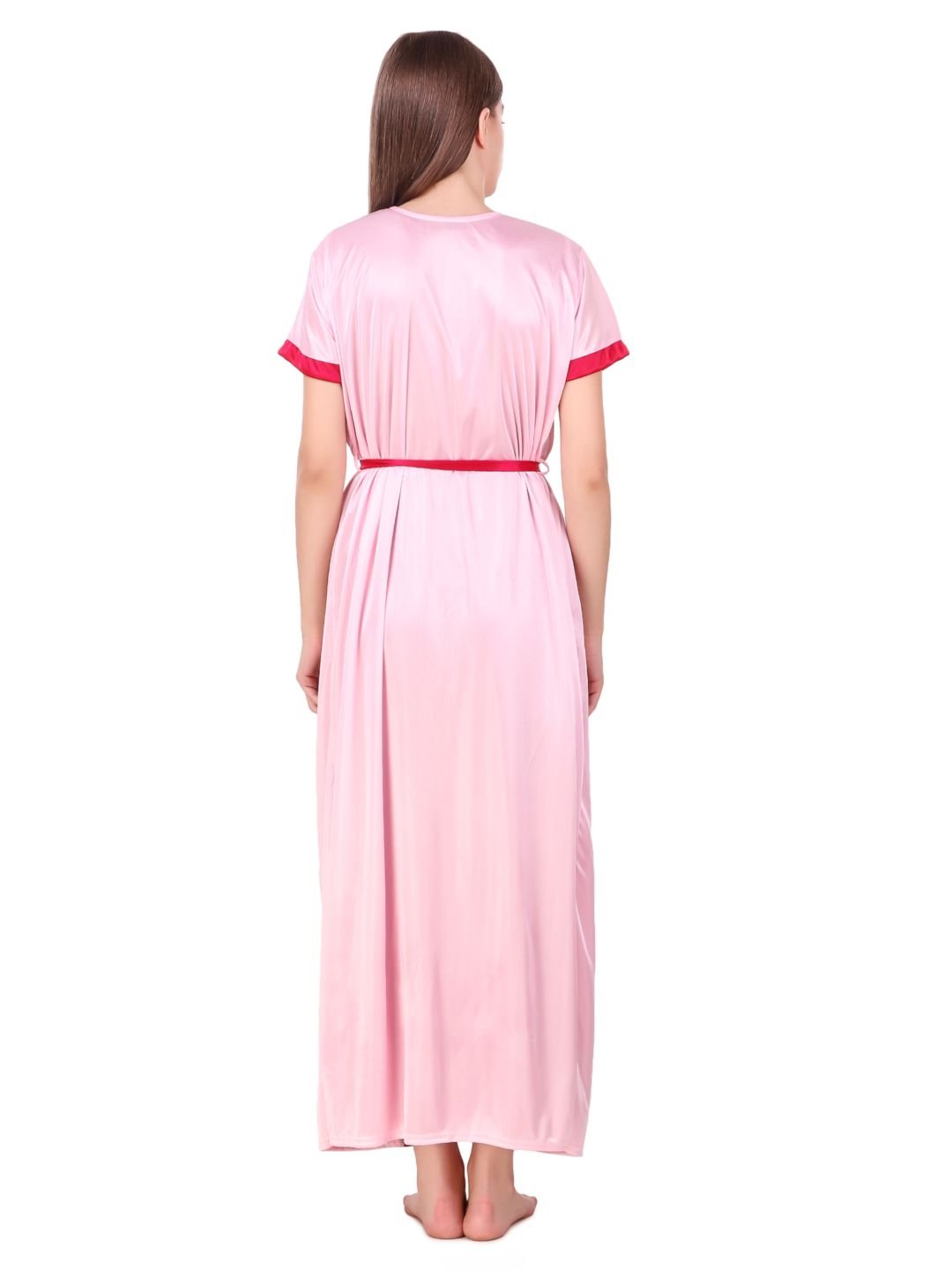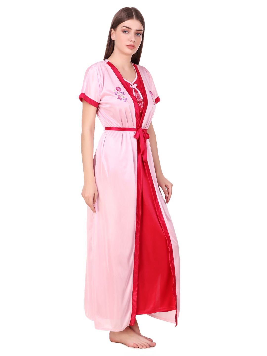 N-Gal Women's Satin Floral Pattern Embroidered Royal Long Nighty Gown with Robe Lingerie 2 Pcs Nightwear Set, Pink