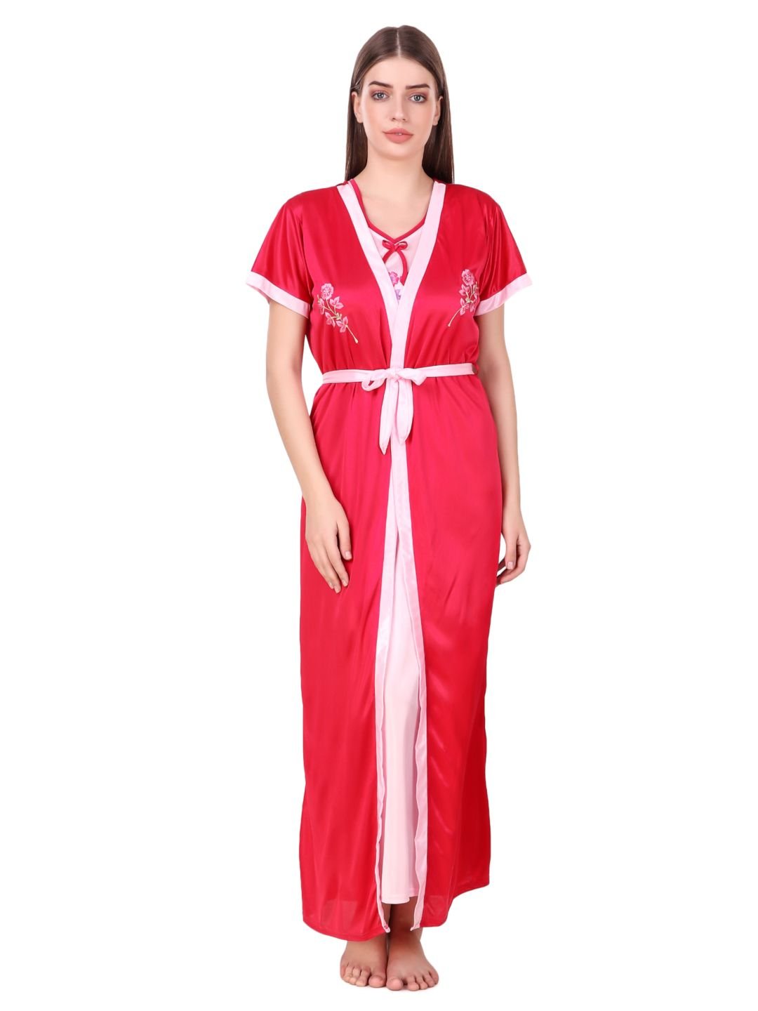 N-Gal Women's Satin Floral Pattern Embroidered Royal Long Nighty Gown with Robe Lingerie 2 Pcs Nightwear Set, Red
