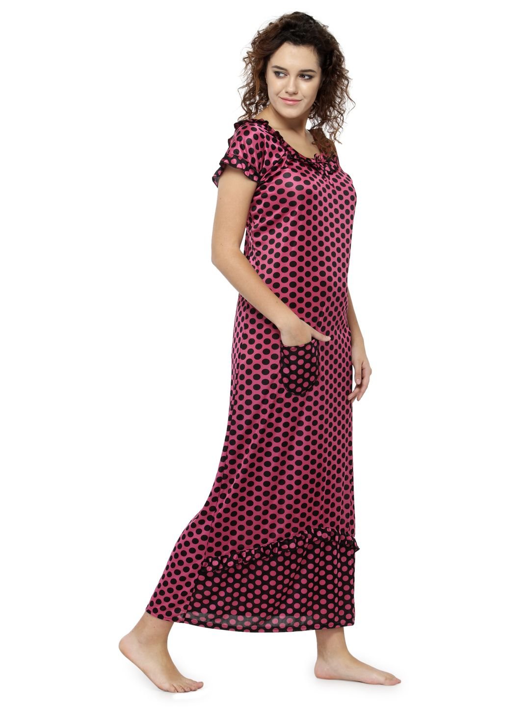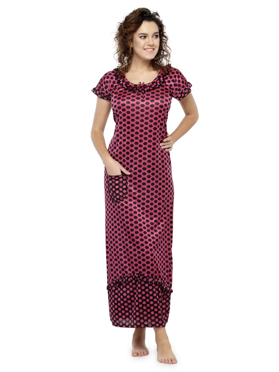 Designed to keep you comfortable while sleeping, this night dress is a must-have. With short sleeves and a soft material, it is sure to become your choicest. This Satin nighty has a frilled scoop neckline with laced details. This Satin nighty is a combination of comfort and luxury . This nightwear is an ideal choice for you, especially if you seek relaxation at night.