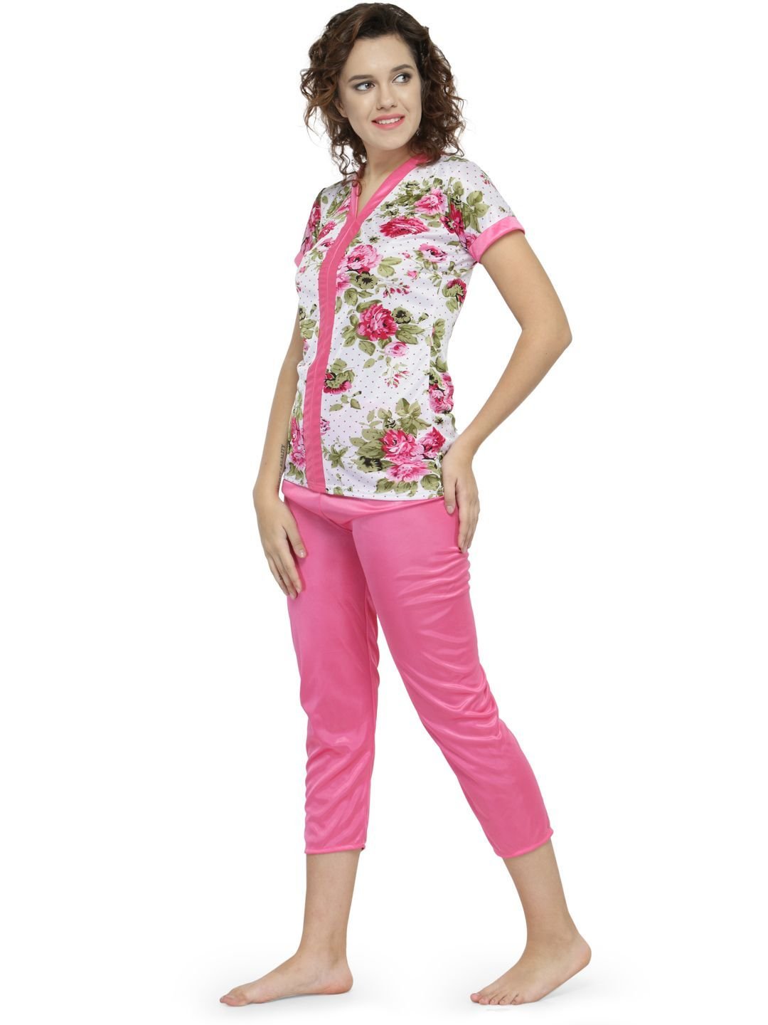 N-Gal Women's Satin Short Sleeves Floral Print Top Pyjama Set Nightwear Nightsuit_Pink_S