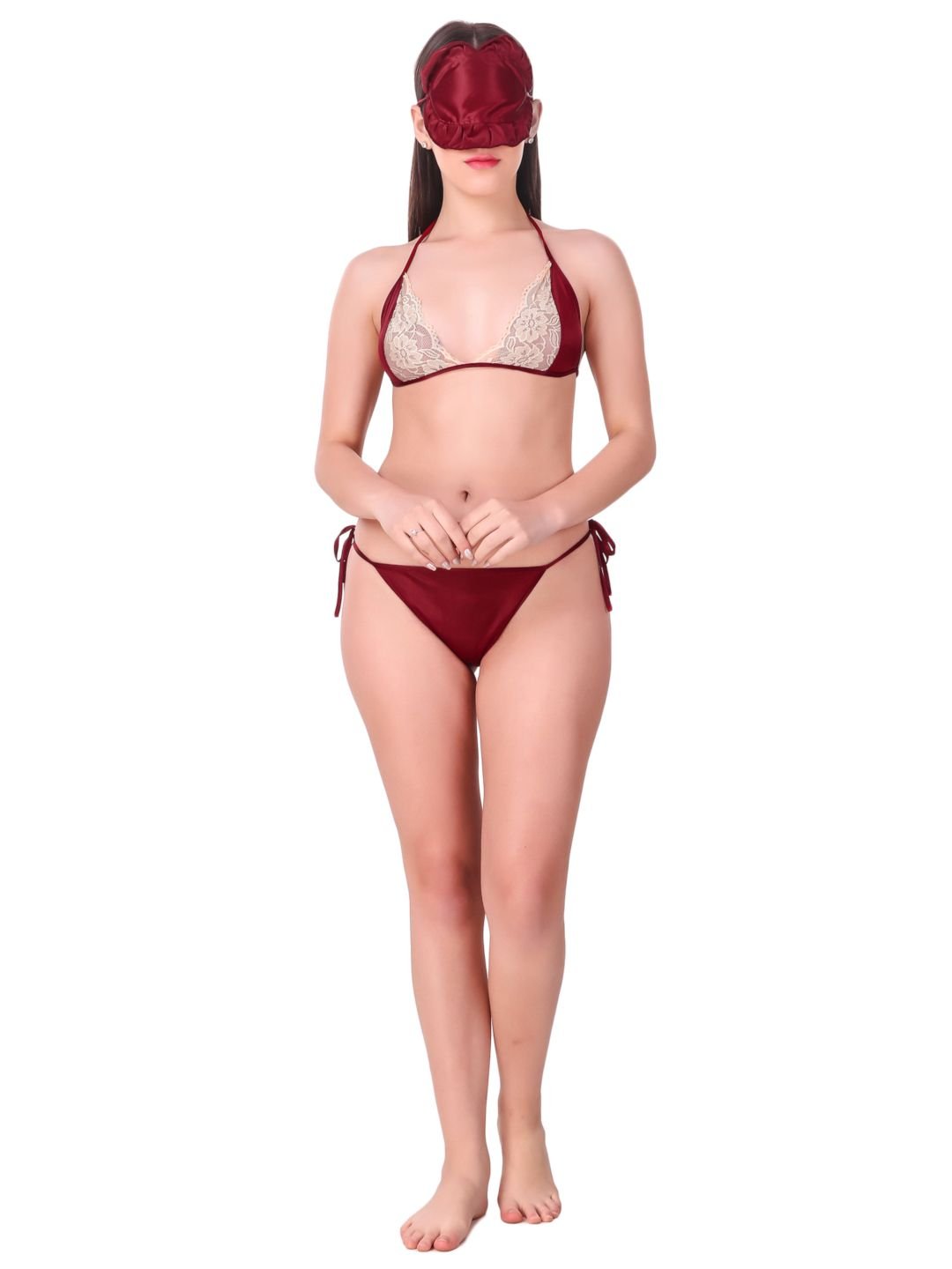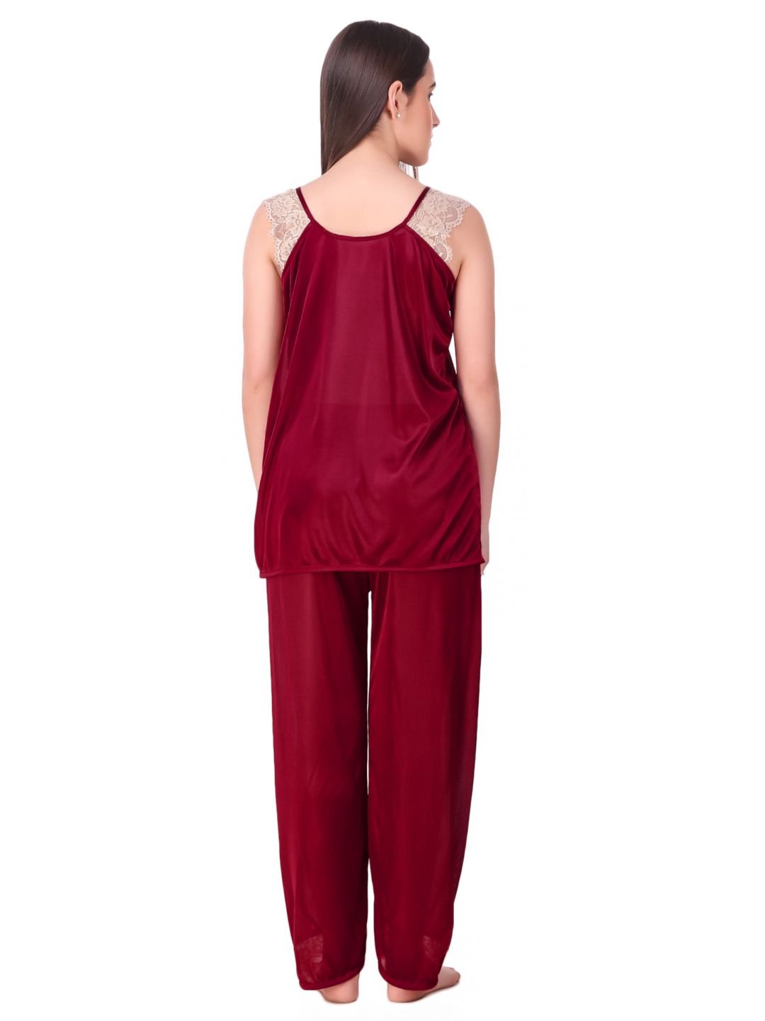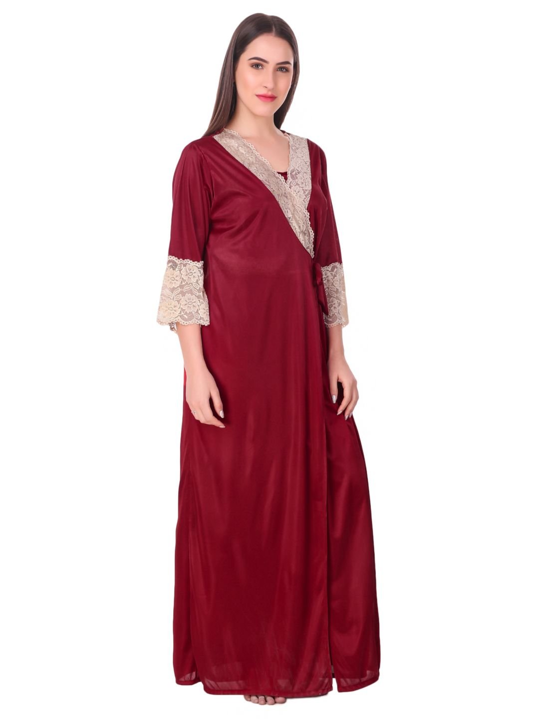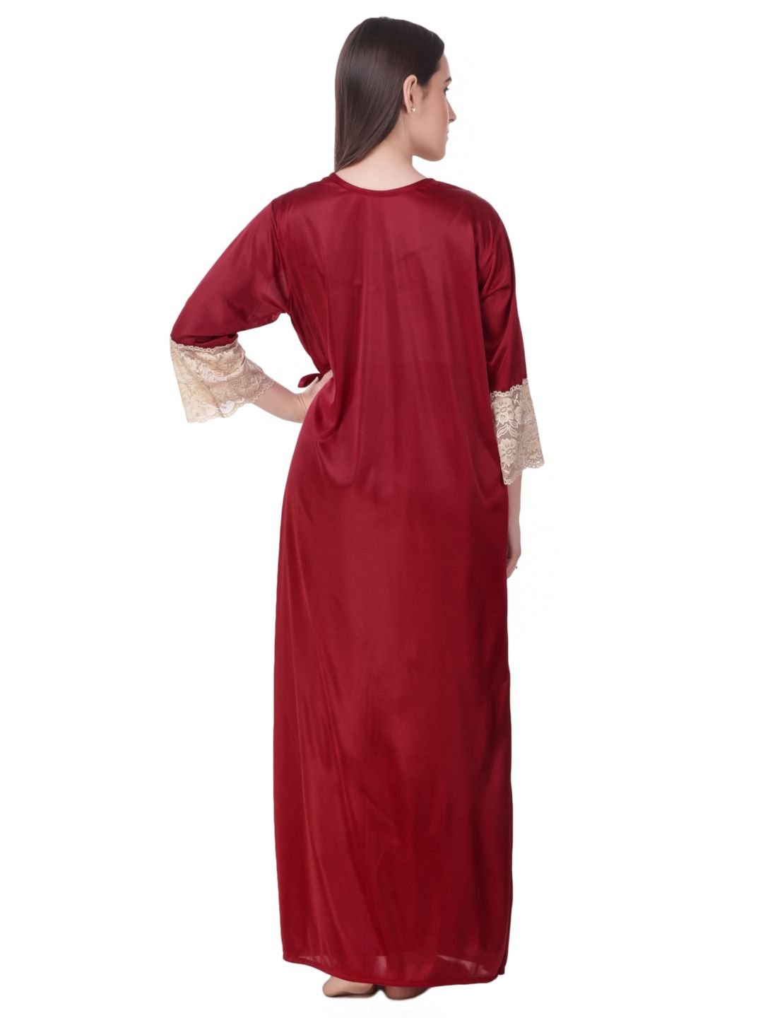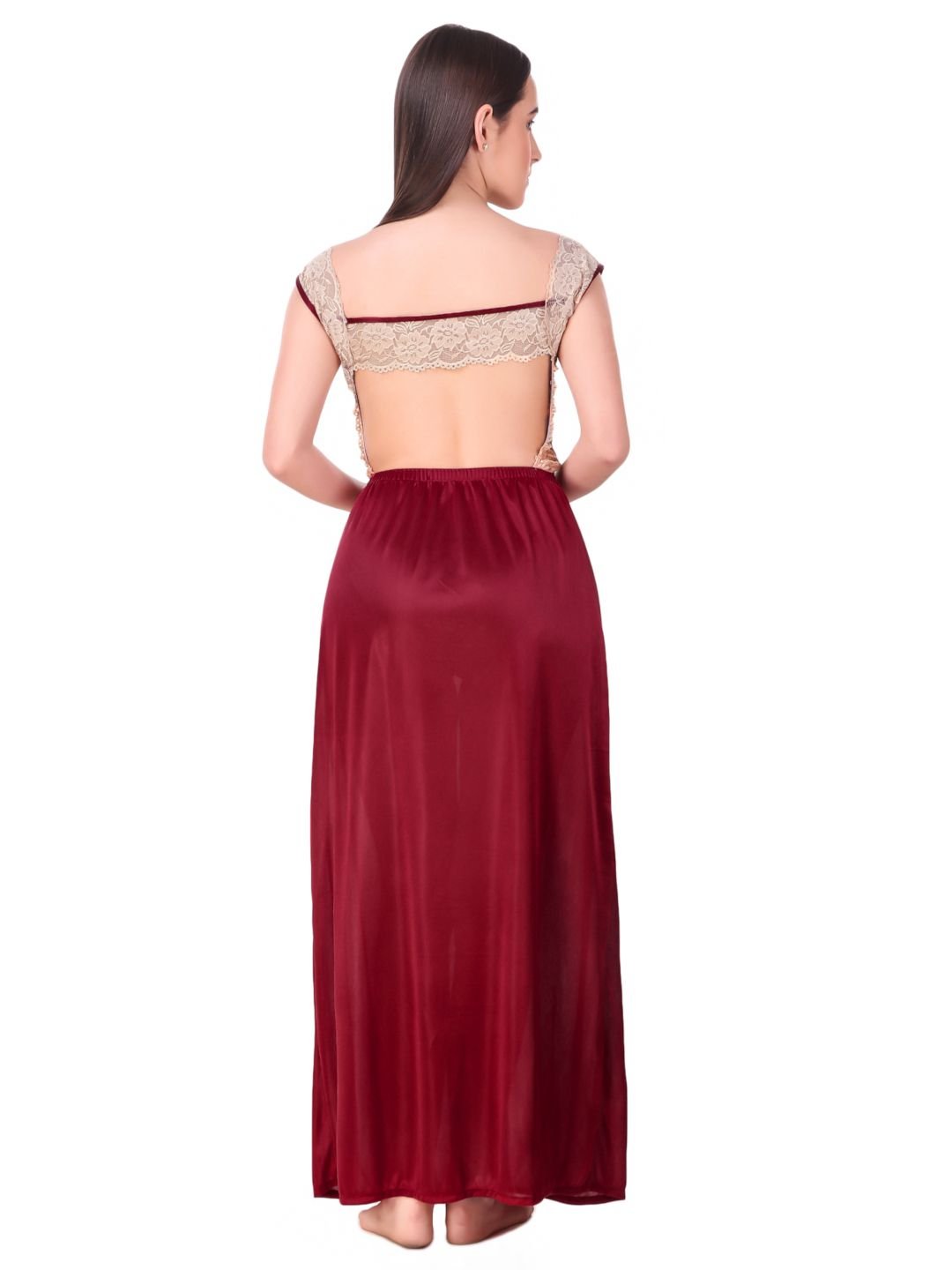 N-Gal Women's Satin Spandex Royal Lace Soft Nighty Lingerie Nightwear_Maroon