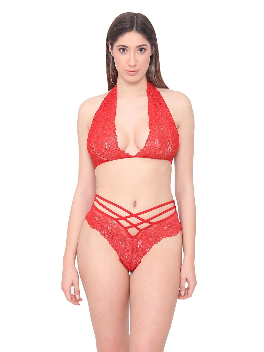N-Gal Women's Sheer Floral Lace Underwear Lingerie Halter Bra Strappy Panty Set_Red